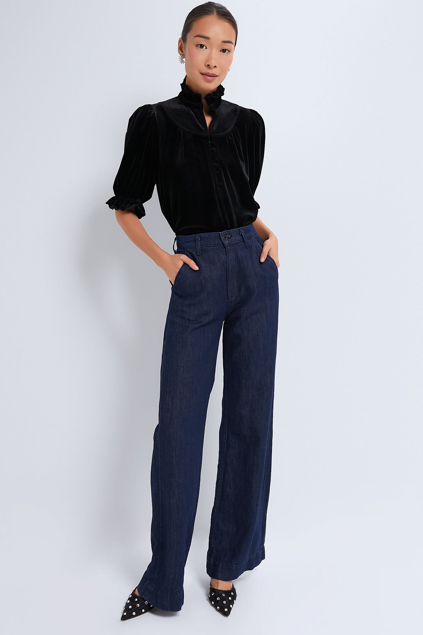 Your favorite top gets a winter update - meet the Velvet Selena Blouse. Effortlessly chic. we love the romantic details of this fun and feminine number. Featuring a ruffle stand collar and quarter length front placket with covered buttons. this puff sleeve piece pairs well with jeans and boots for daytime and can be elevated with trousers and gold jewelry for dining out.
