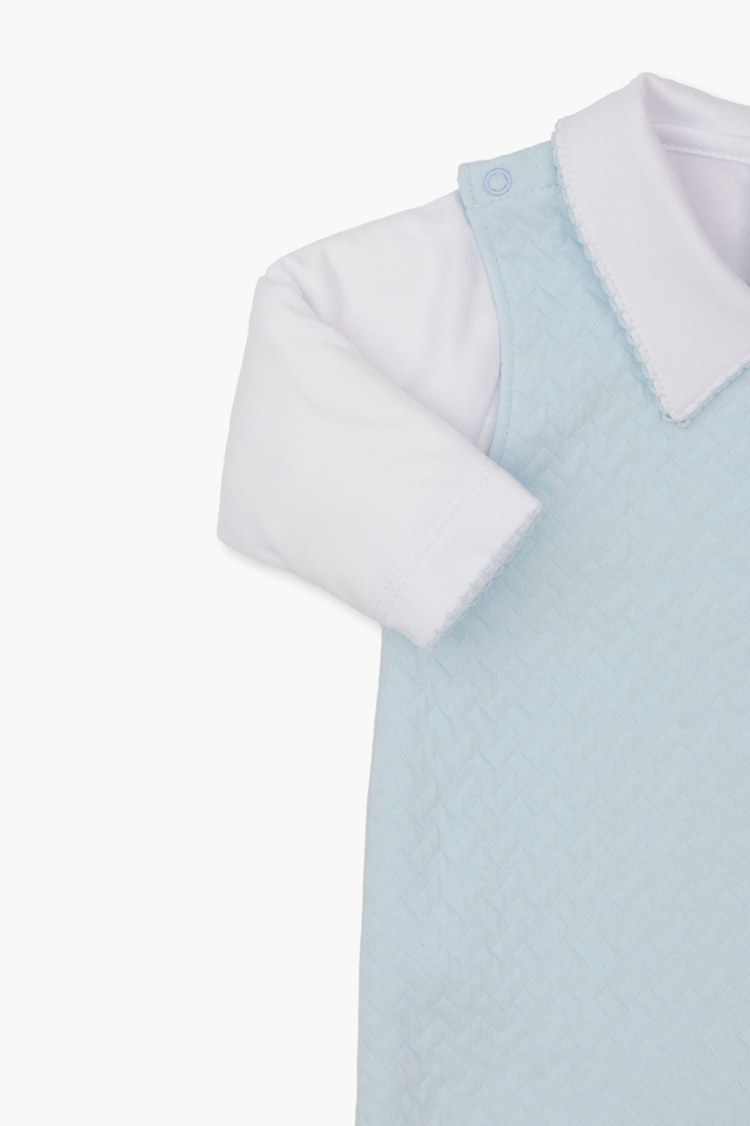 The perfect addition to your baby's wardrobe. the Blue and White Jacquard Overall Set is all kinds of adorable. Made to feel oh-so-comfortable against your little one's skin thanks to that lovely pima cotton. this two piece style features an inner onesie with a collar and long sleeves. and an outer sleeveless quilted layer — with plenty of snap closures throughout to make changing easy! Rest assured that your kiddo is cozy and comfy whenever this style is in the rotation.