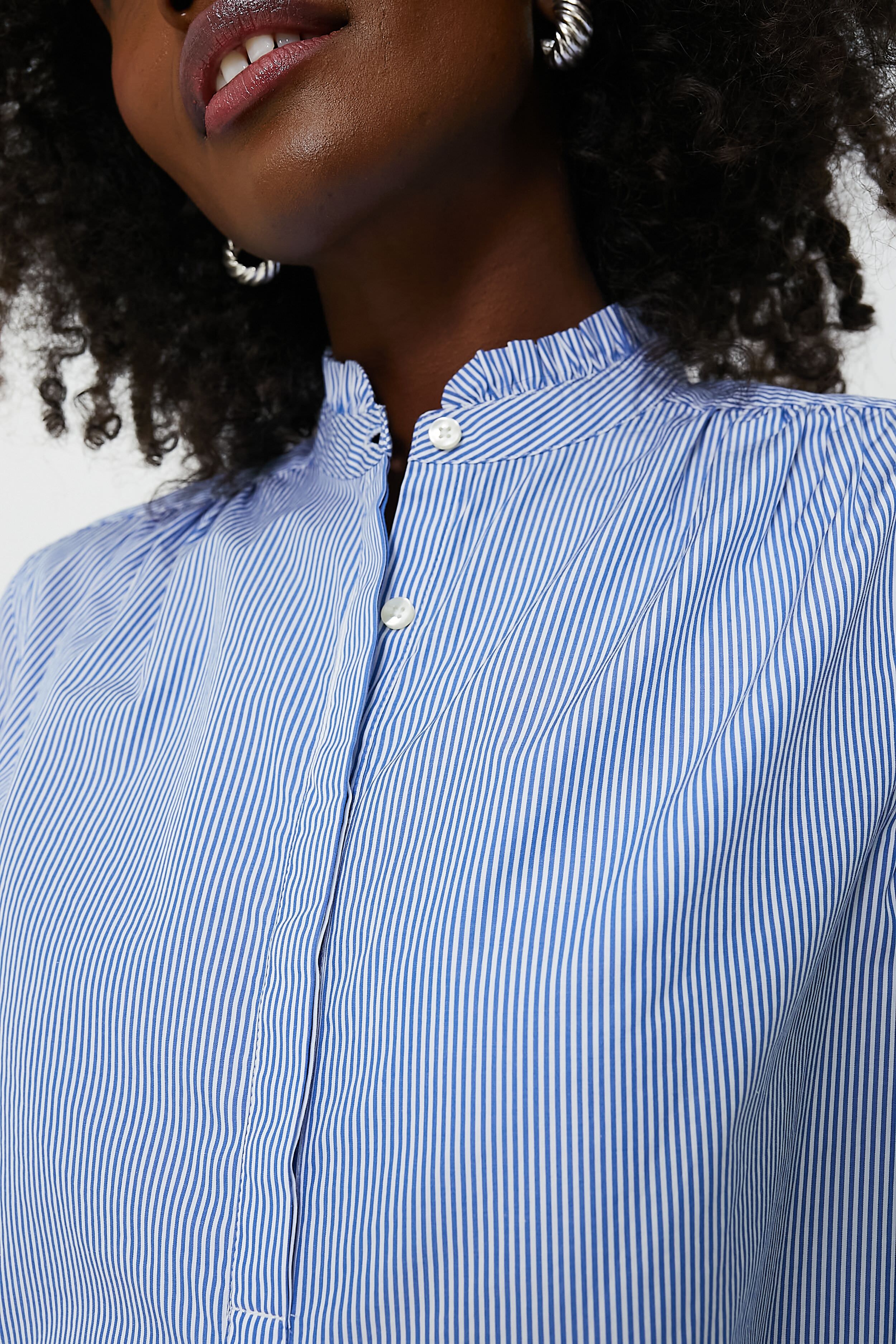 Effortless yet put-together. the Blue and White Stripe Sara B Henley is a twist on the classic button-down. Feminine and casual. this top features a standup ruffle collar and a hidden button placket. Pair with denim and flats for work or brunch with friends.