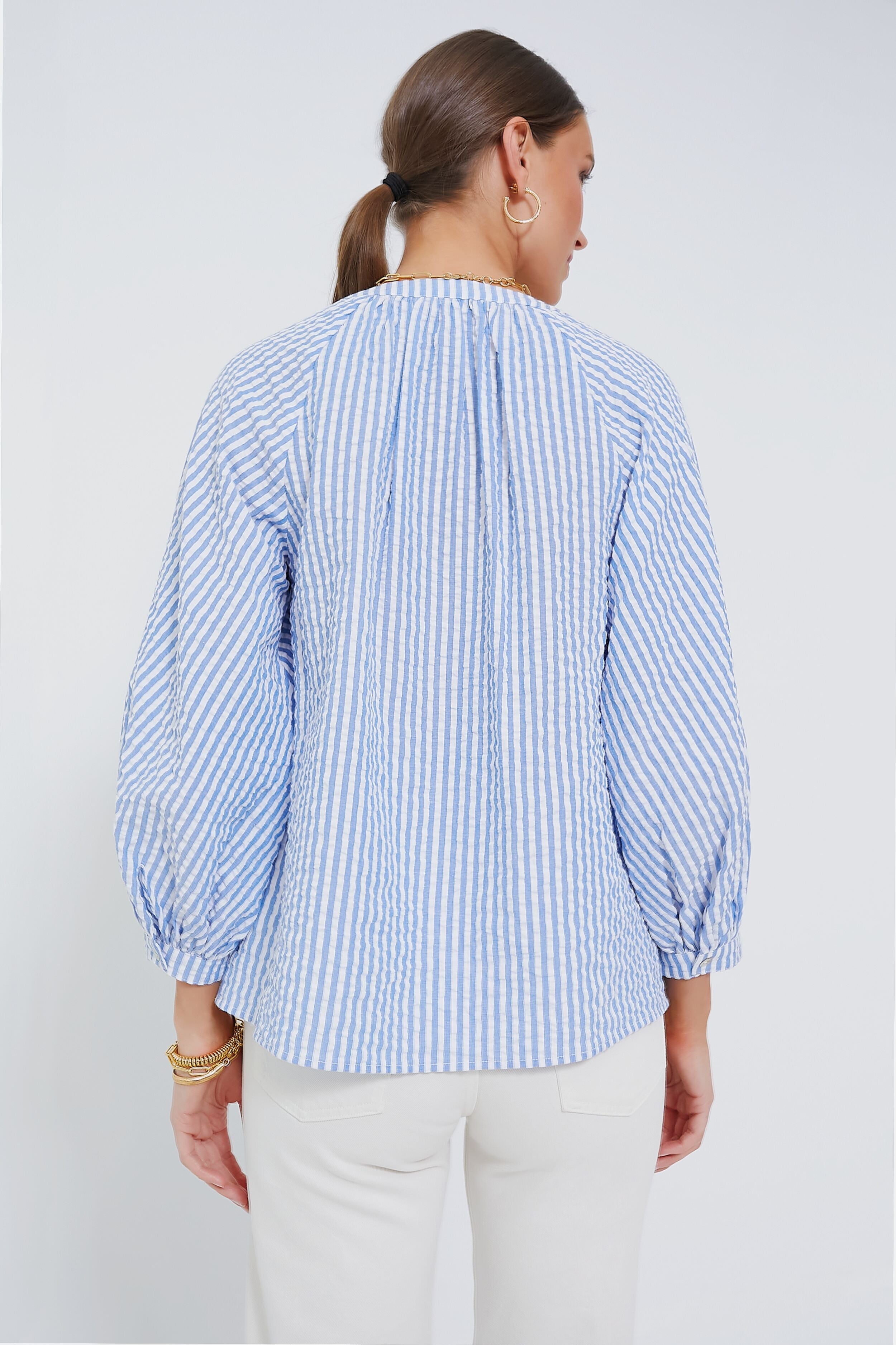 Seersucker. check. Blue and white stripes. check. Mother of pearl buttons. check. The Tallie Top is everything we want when it comes to seasonal wear. Effortless and lightweight. this blouse pairs perfectly with denim of all colors. flats or sandals. tucked in or left loose. from desk to drinks this classic-with-a-twist silhouette is working overtime.