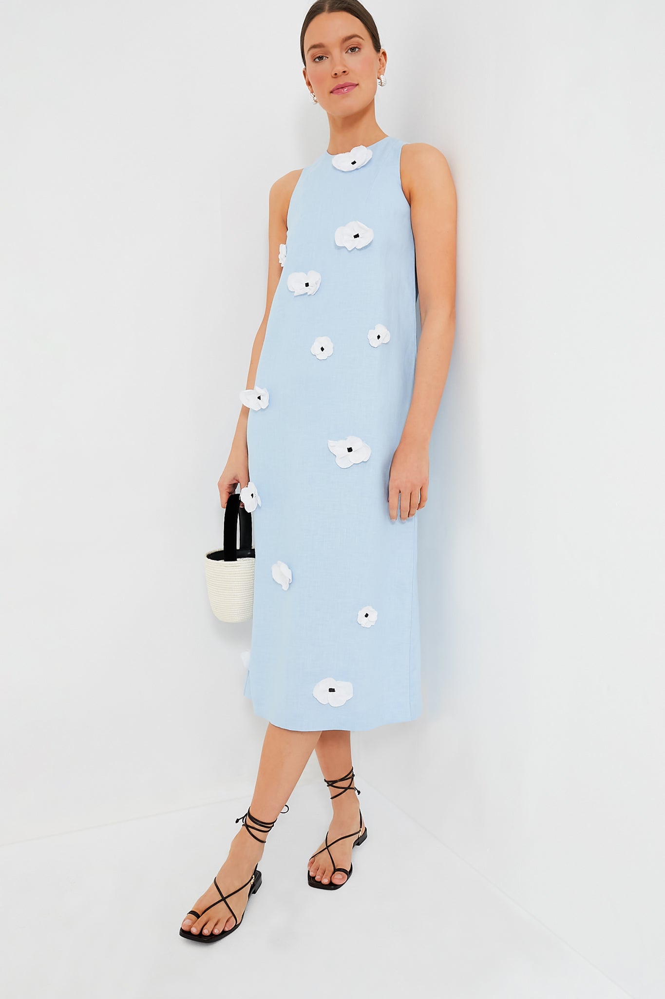 We are loving this Blue Bloom Maxi Linen Dress- a midi-length sundress in blue linen. adorned with handcrafted poppies across the front. The flared silhouette features a rounded neckline with a concealed zip at the back. subtle darts at the bust. and a straight hem with a center back slit. Slip on a pair of summer sandals for an easy yet elevated ensemble.