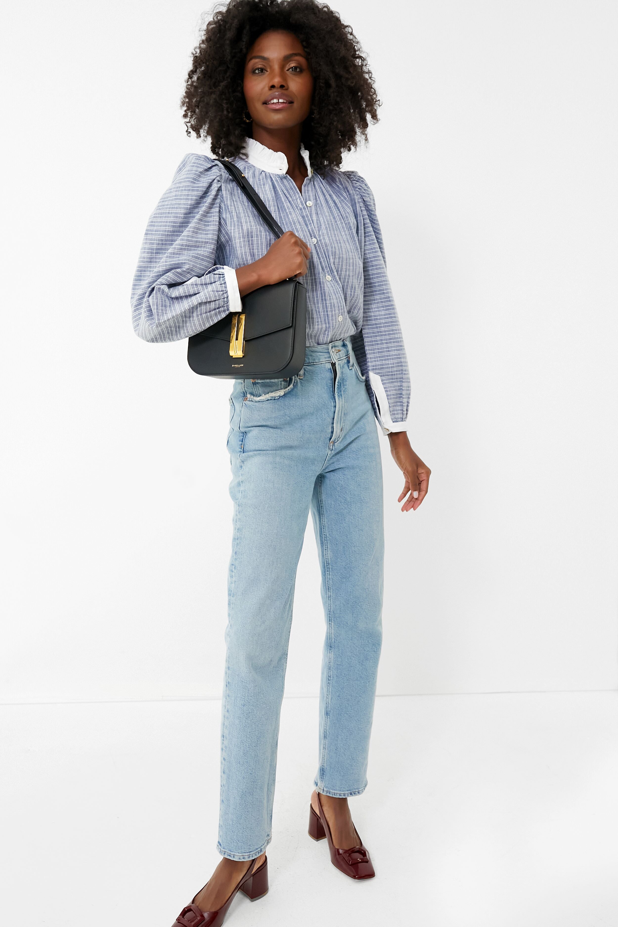 Adorned with subtle pinstripes. the charming Blue Chambray Annabel Shirt is a staple in any season. Finishing touches include a contrast ruffle collar. subtle puff shoulders. mother of pearl buttons down the placket. and a floaty fit that all come together to create an understated but elegant top. Made of lightweight cotton. this style is beautifully paired with trousers for an elevated ensemble or tried-and-true denim for a retro-inspired boho-chic look.