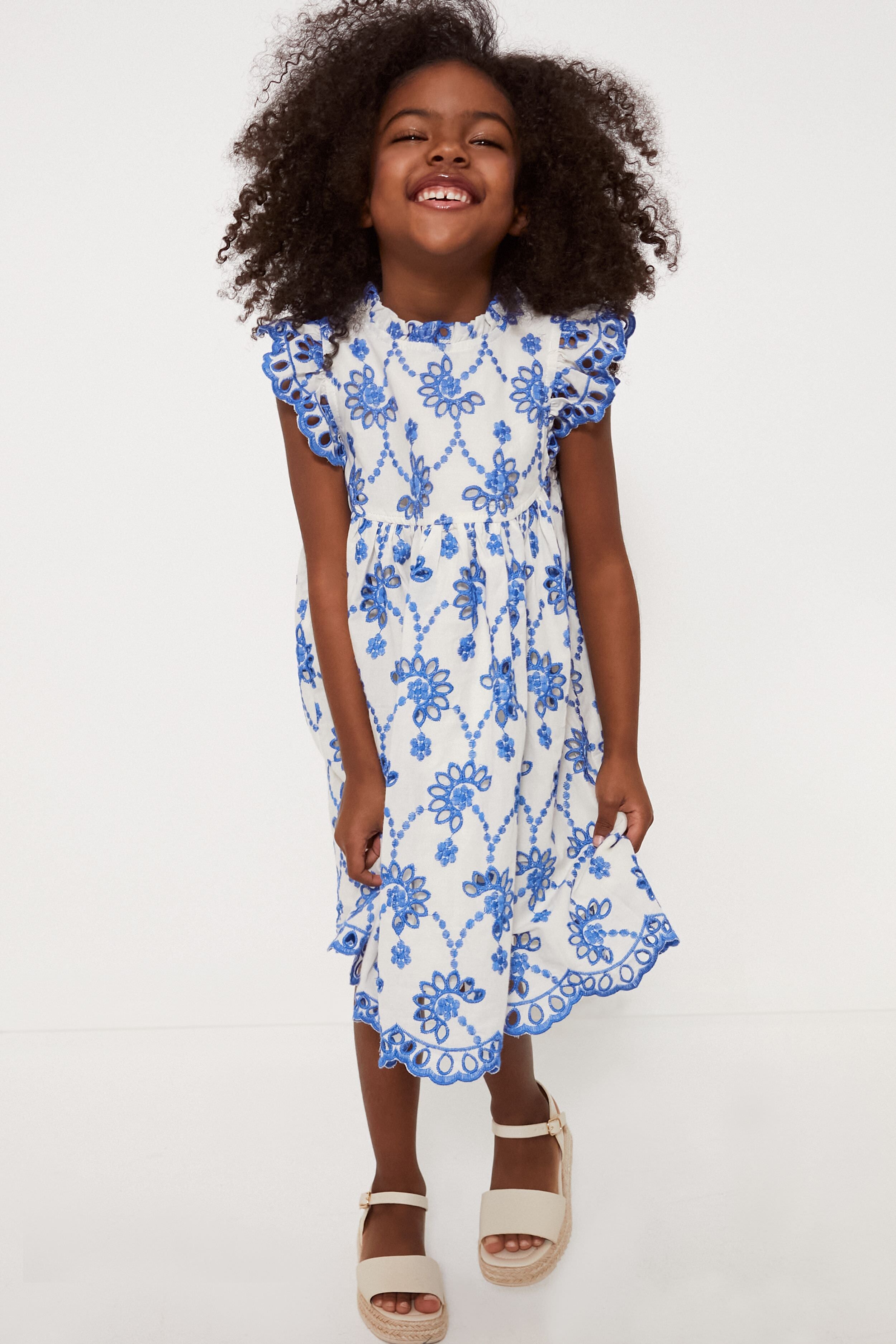 All eyes are on the Girls Cynthia Dress in Blue Eyelet. A swirling true blue embroidered floral pops against a crisp white ground to make this extra special frock sing. Perfect for birthday parties. brunch with grandma or even a special night out. this dress will become an immediate heirloom. The scalloped hem and sleeves and charming ruffle neck detail add to the classic look.