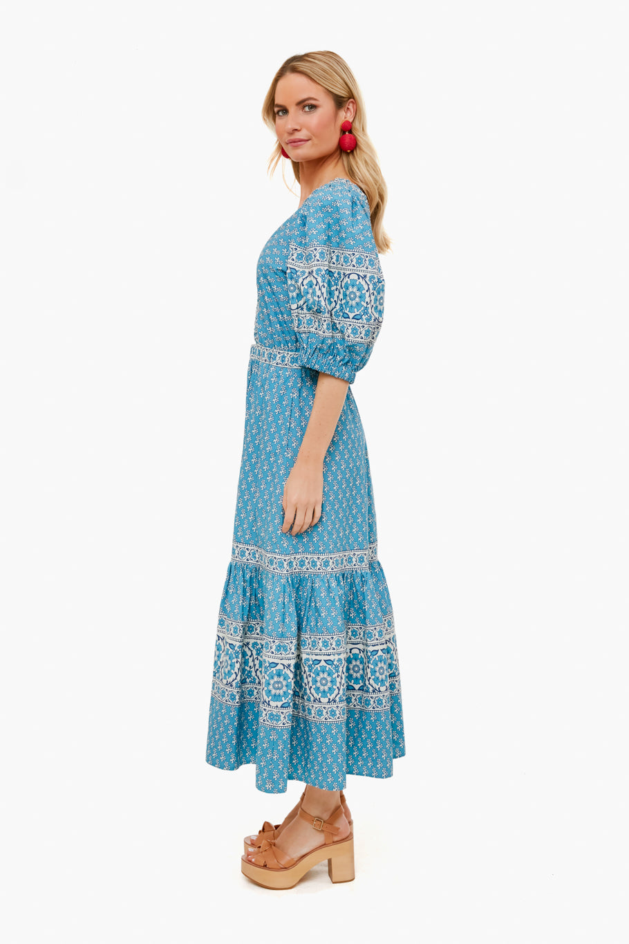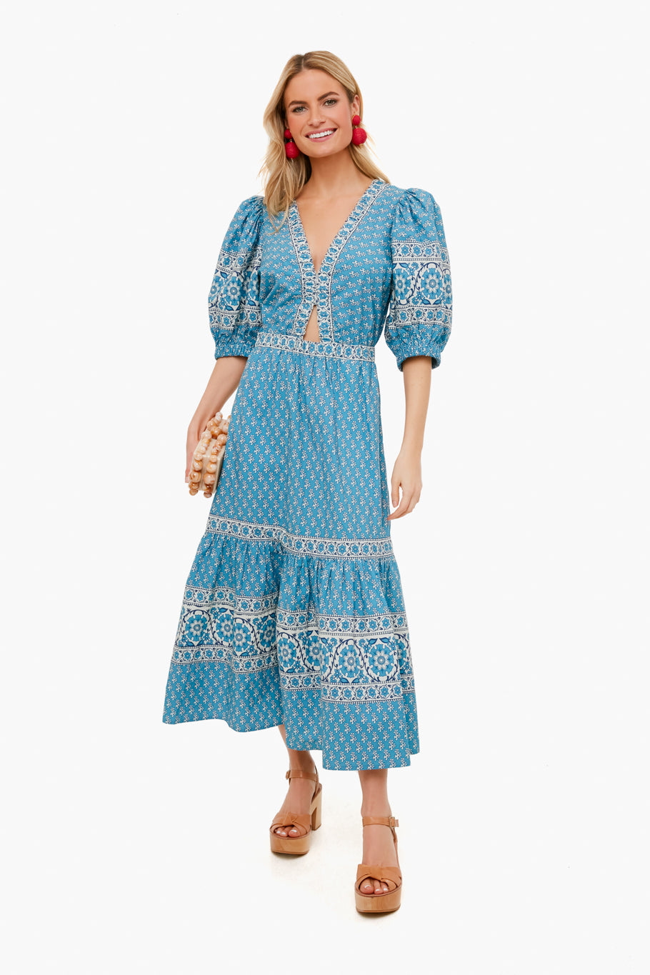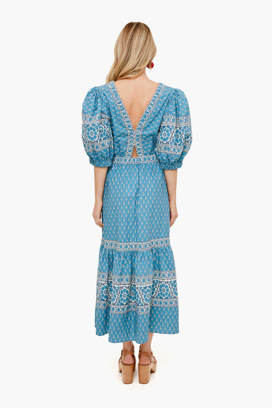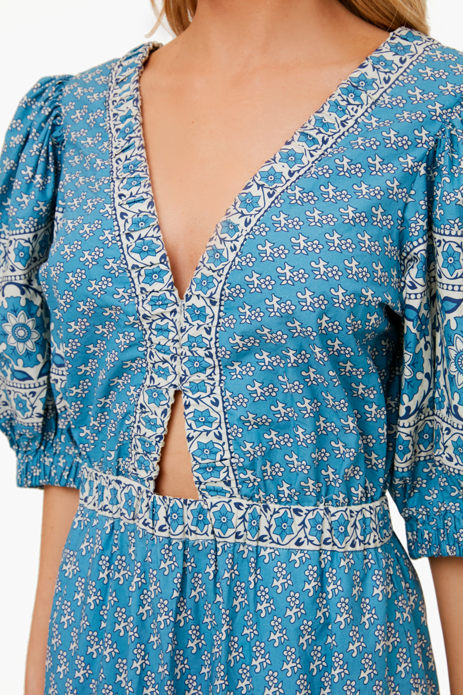 The Blue Fernanda Dress features a boho tile print. voluminous puff sleeves. and cutouts at the neckline. Effortless and breezy. we are wearing this with chunky heels and simple jewelry for a head-turning. warm-weather look.