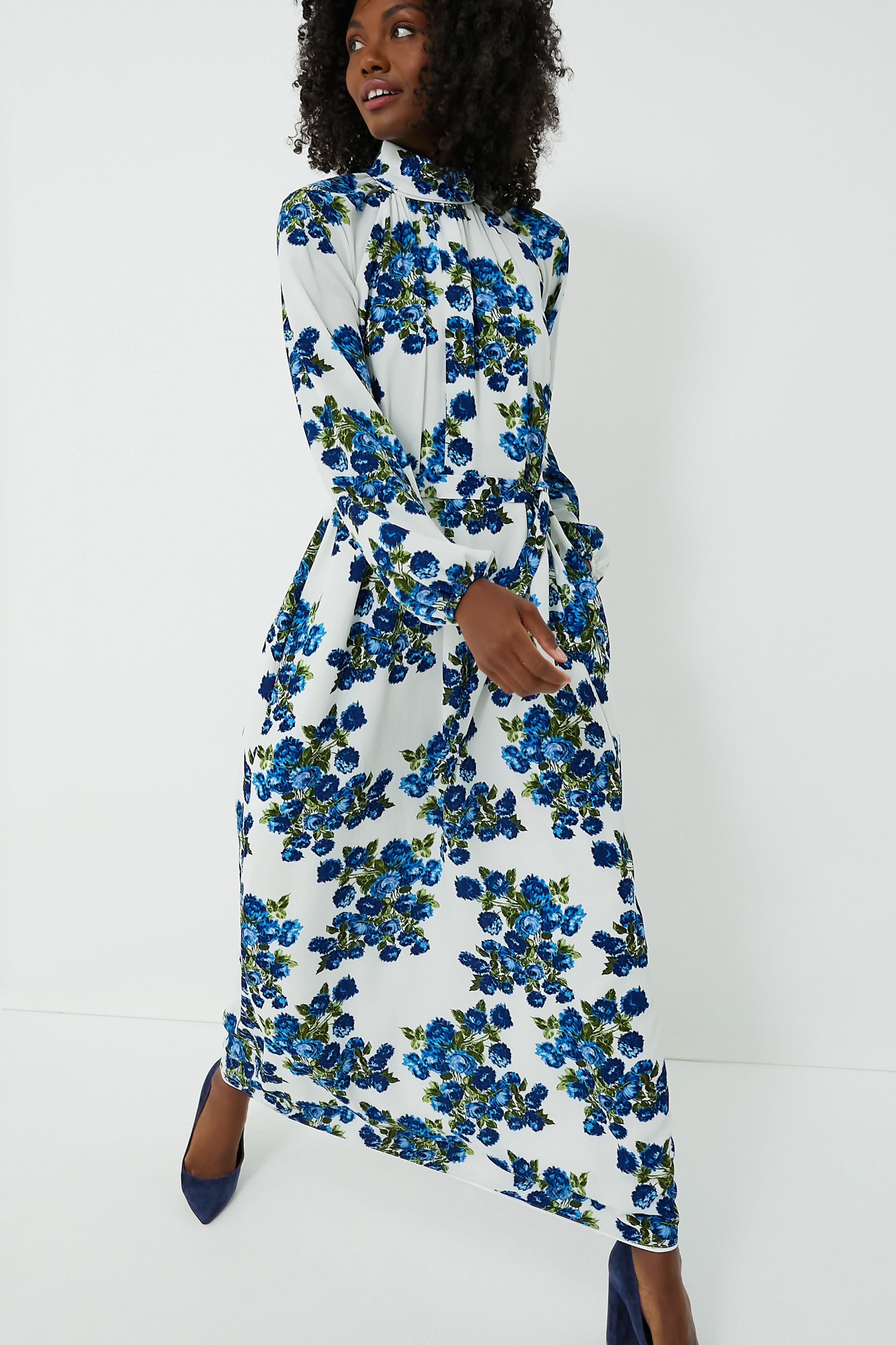 Beautifully crafted for an alluring look. the Elanda Dress features charming blue florals printed on lightweight crepe georgette. Effortlessly elegant with plenty of freshness and femininity. this maxi features a mock neckline that buttons at the back. billowy blouson sleeves. and a self-tie belt to cinch the waist and create your perfect fit. Complete your look by adding heels and statement earrings. then you are easily event ready!