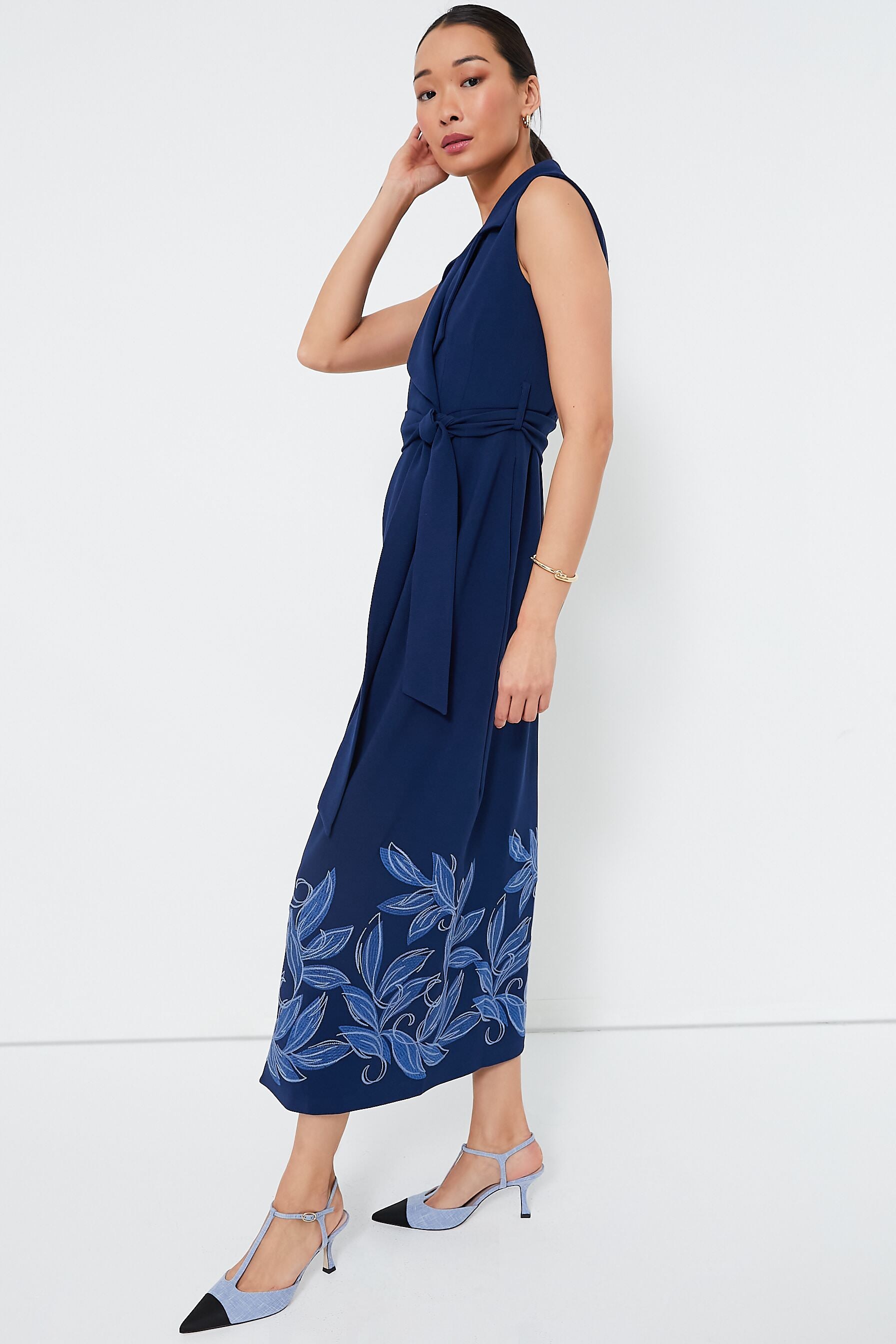 Introducing the Blue Leaves Noemi Dress- a flattering silhouette that can be worn for year-round occasions. This maxi dress boasts an oversized notch collar. a self-tie waist. and an open leg slit. creating a look that is equal parts sophisticated and flirty. Pair with heels and silver hoops or with a statement necklace and flats.