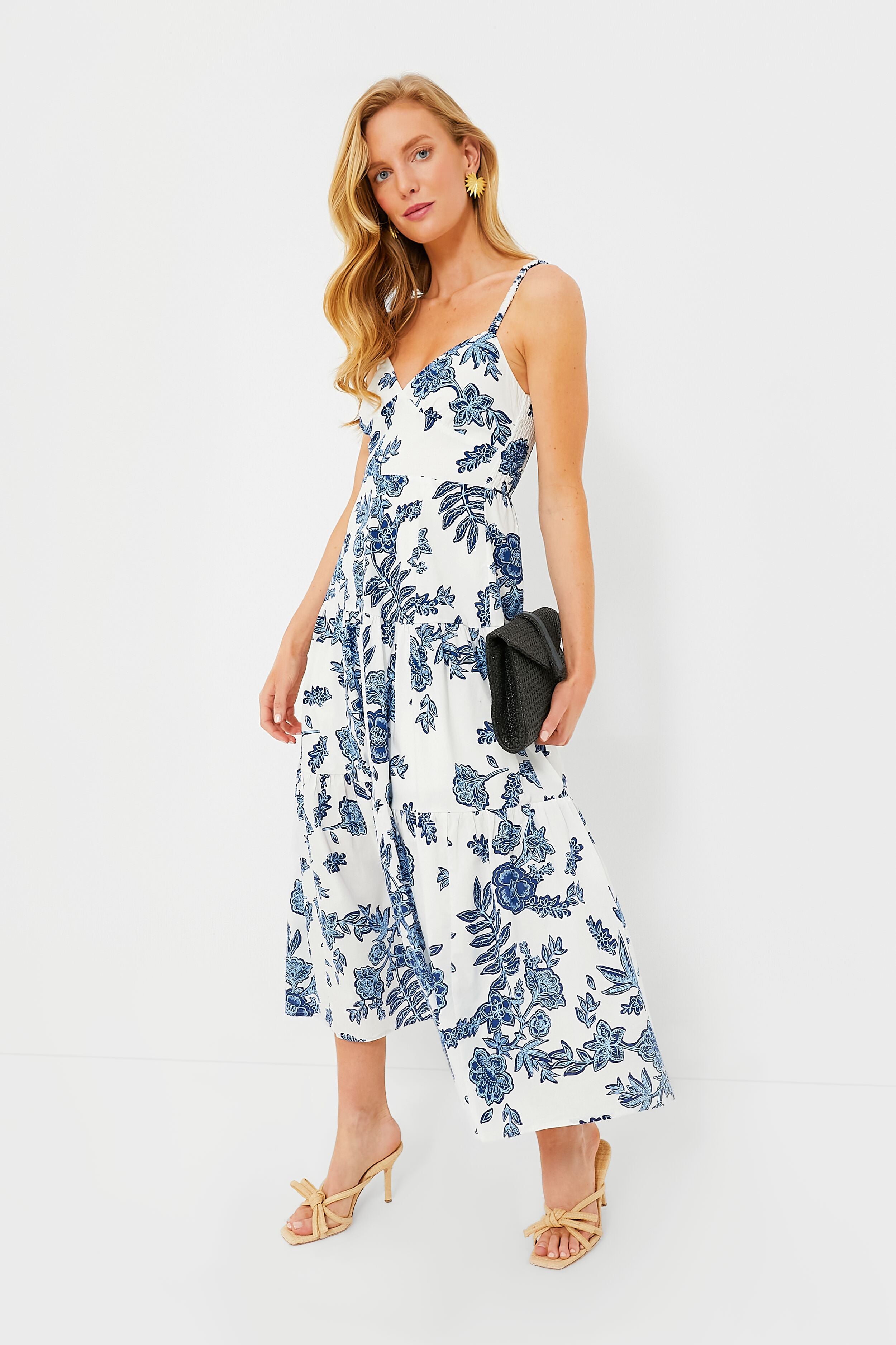 The Blue Multi Plunge Dress is a perfect go-to maxi for dressing up or down. boasting an effortless silhouette with a charming floral print. The adjustable spaghetti straps. fitted bodice. and tiered skirt create a flattering shape that can be worn for occasion after occasion. We are styling this with raffia accessories for a vacation look. or with heels and gold hoops for a dinner date.
