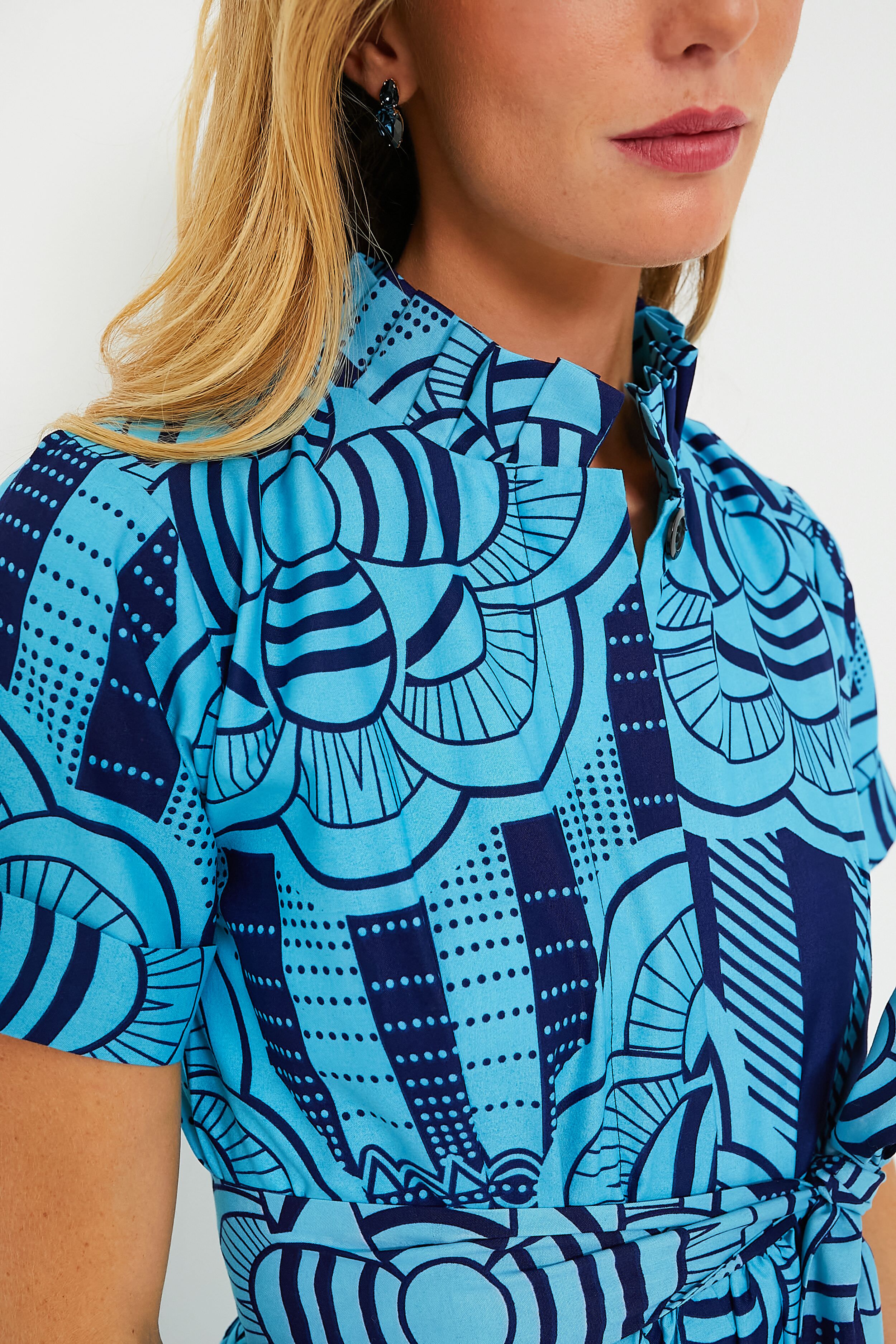 Subtle in silhouette. with a bold touch from the fantastical print. the Blue Olori Dress is a stellar statement-maker! The elegantly structured mock neckline and sleeves are balanced by the floaty tiered skirt to create a style that is equal parts soft and strong. Pair with heels and gold jewelry for luncheons with your ladies. or with a clutch and statement earrings for a night out on the town.