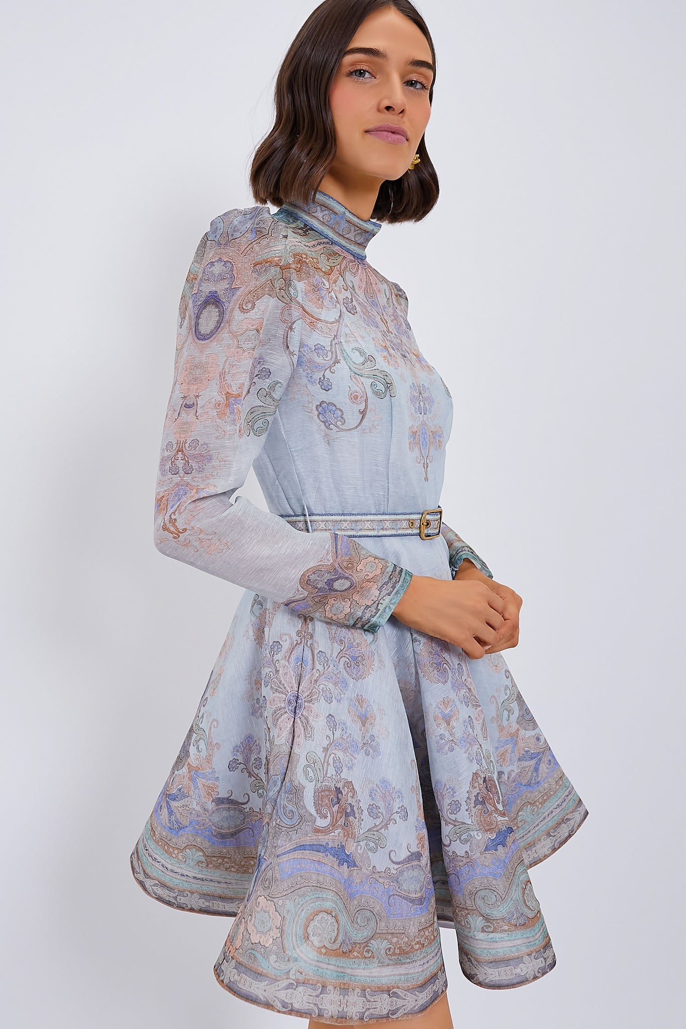 The Eden Dress is an ethereal style featuring a stand collar. puffed shoulders. and a full A-line shirt with an enchanting pattern. Perfect for all of the upcoming events in your life. we are styling this with heels. a clutch. and pearls for a breathtaking look.