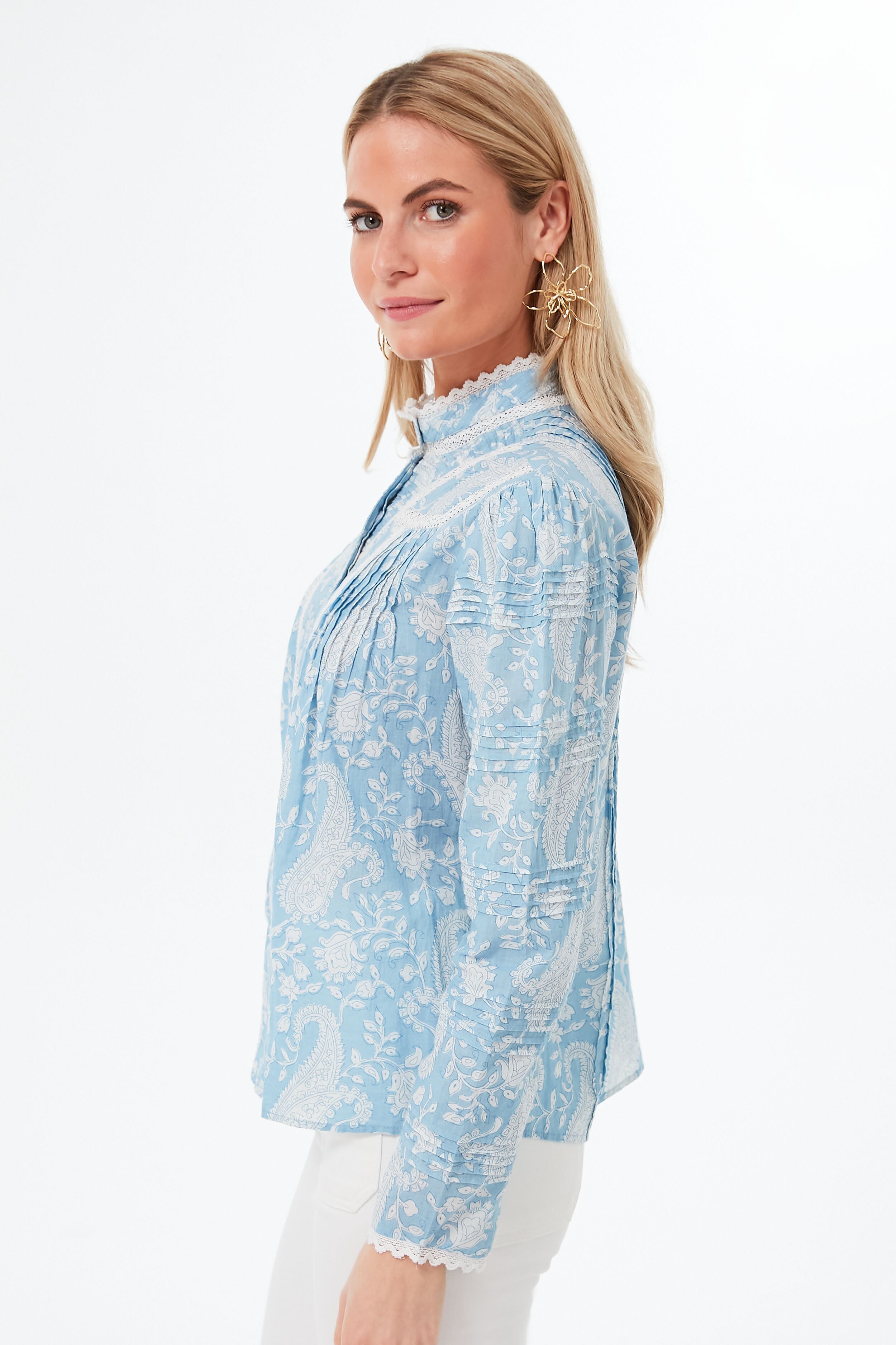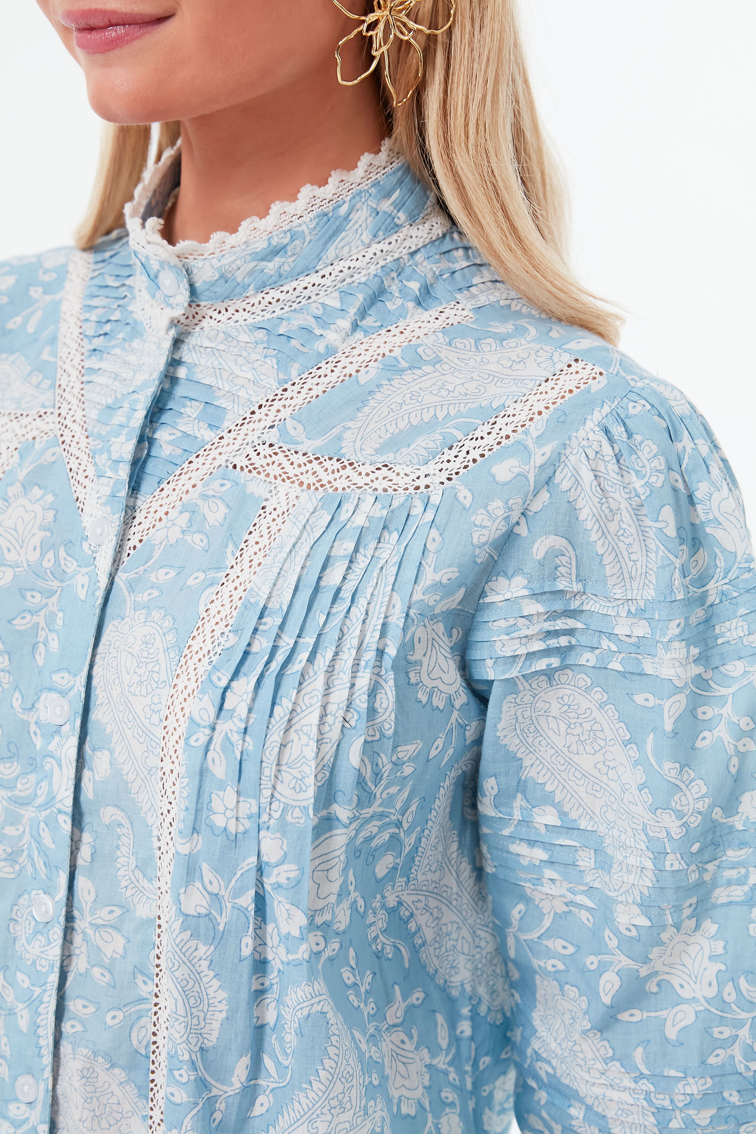 We can promise you'll be feeling anything but blue with the Priya Shirt! This blouse was designed with crochet eyelet trim. pintucking details. and a fresh paisley pattern that fully captures the essence of unfussy femininity. Pair with white denim and sandals for park picnics. showers. and anything else on your social calendar this season.