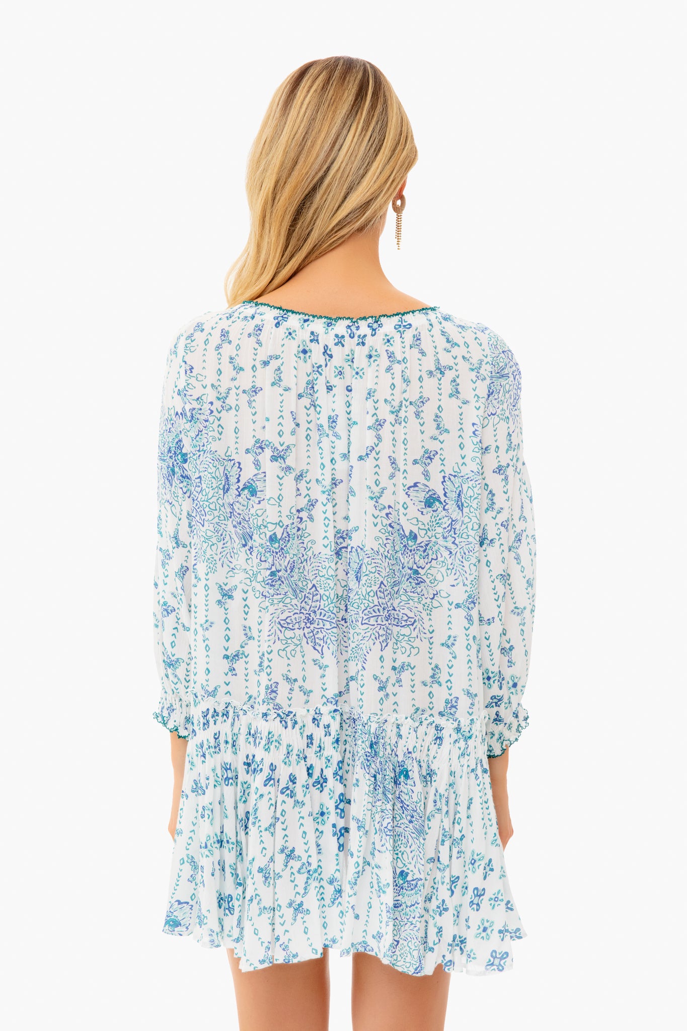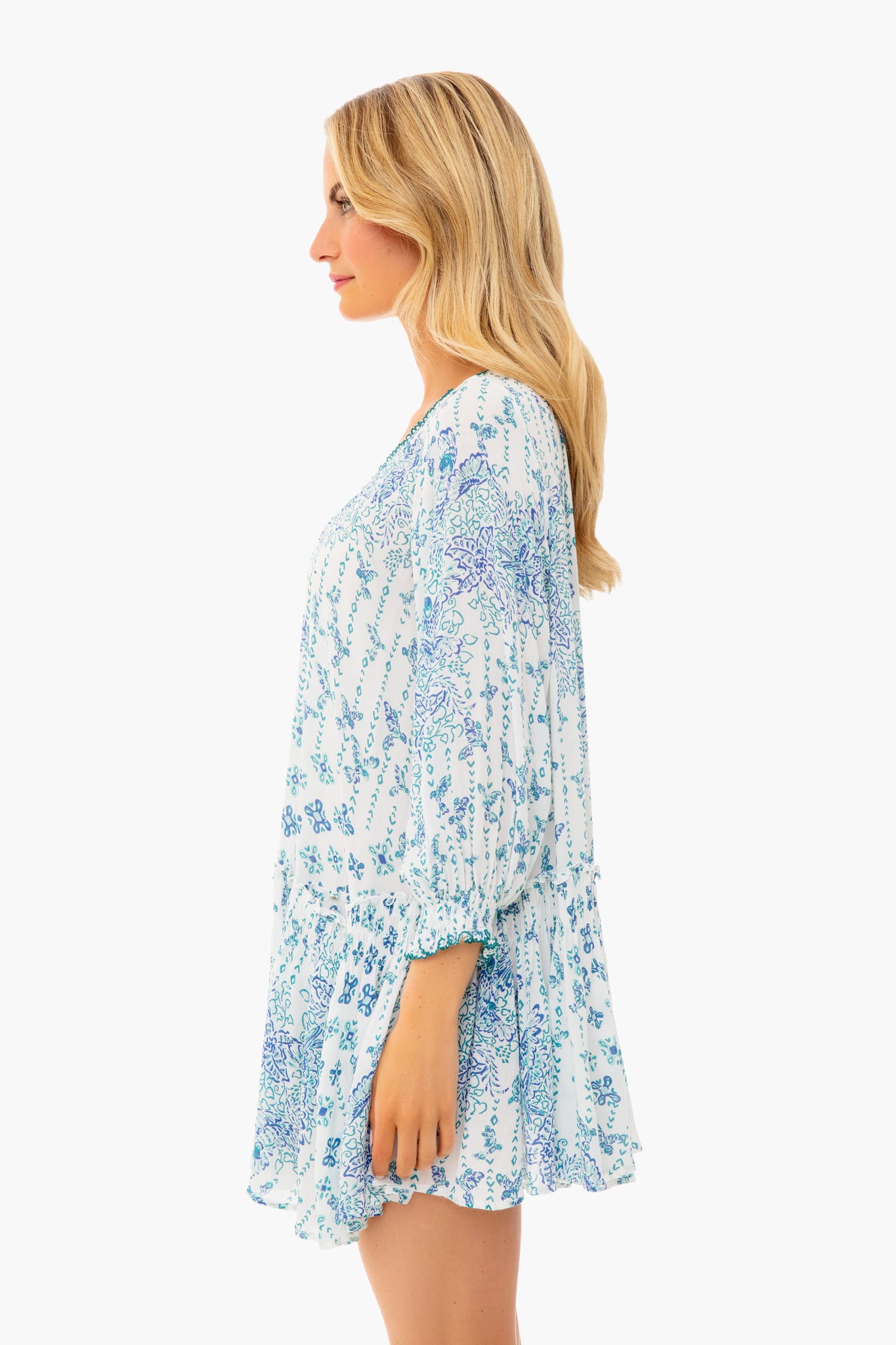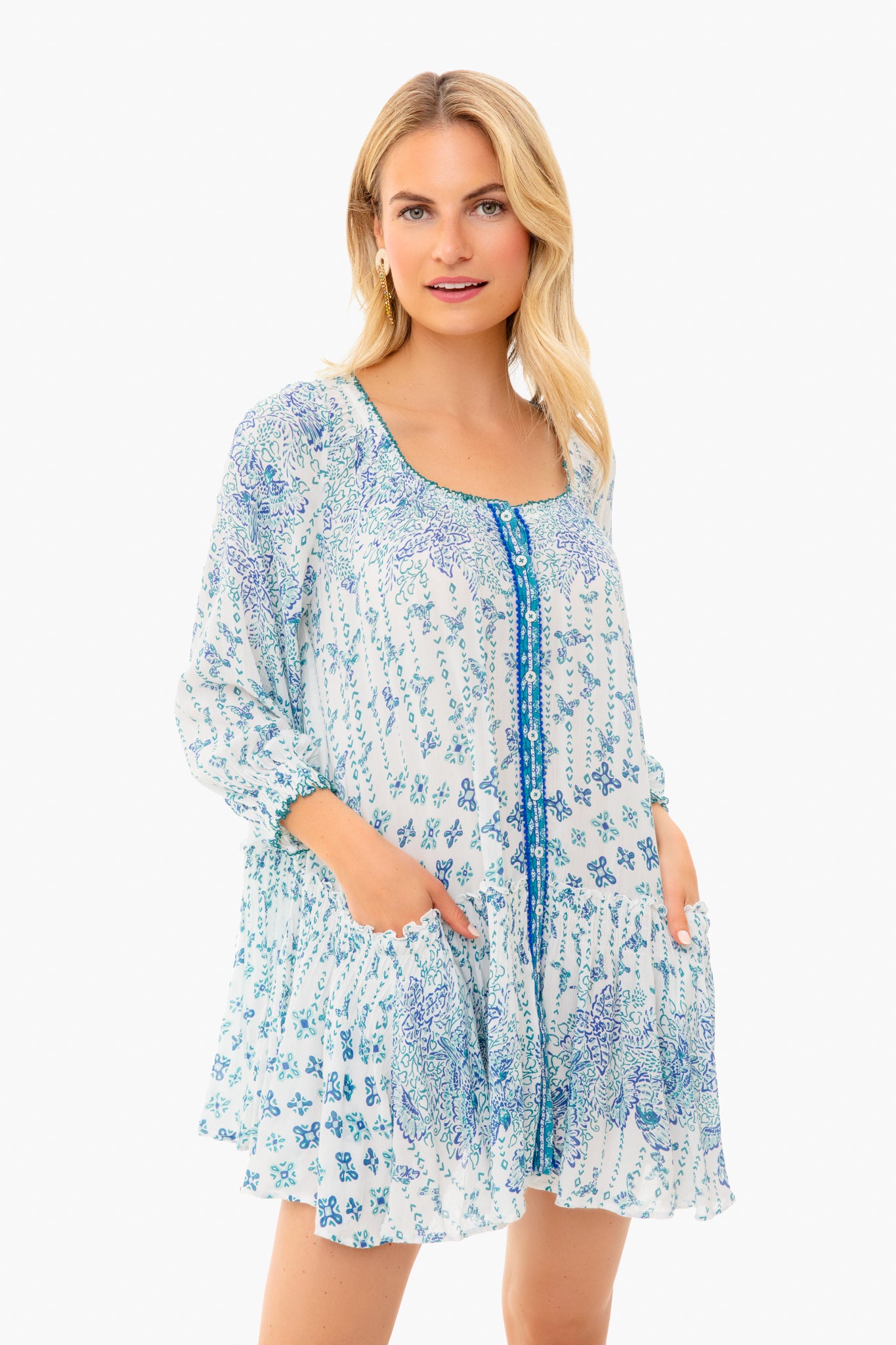 The Blue Parrot Tesorino Mini Dress is made from organic fabric with a batik print. A scoop neck. flounce hem. button front placket. and blouson sleeves add a bohemian flair to this mini. This style works well as a caftan or easy day dress when paired with raffia accessories and sandals!