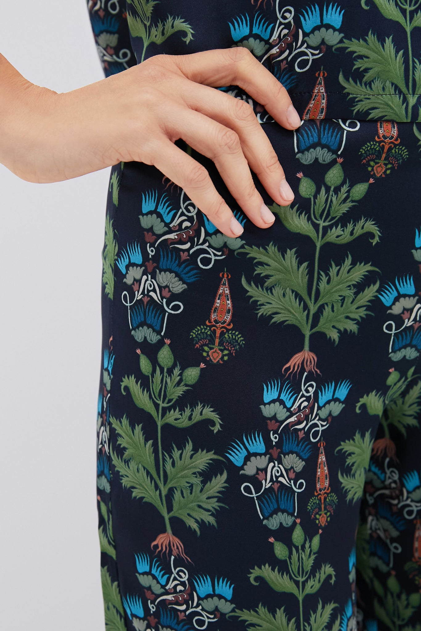 The silk satin Blair Trousers offer a flattering. elongating silhouette that balances dressy elegance with relaxed comfort. Featuring an alluring Persian Botanic print. these enchanting pants pair perfectly with the matching Blue Persian Botanic Gabrielle Top and heels.