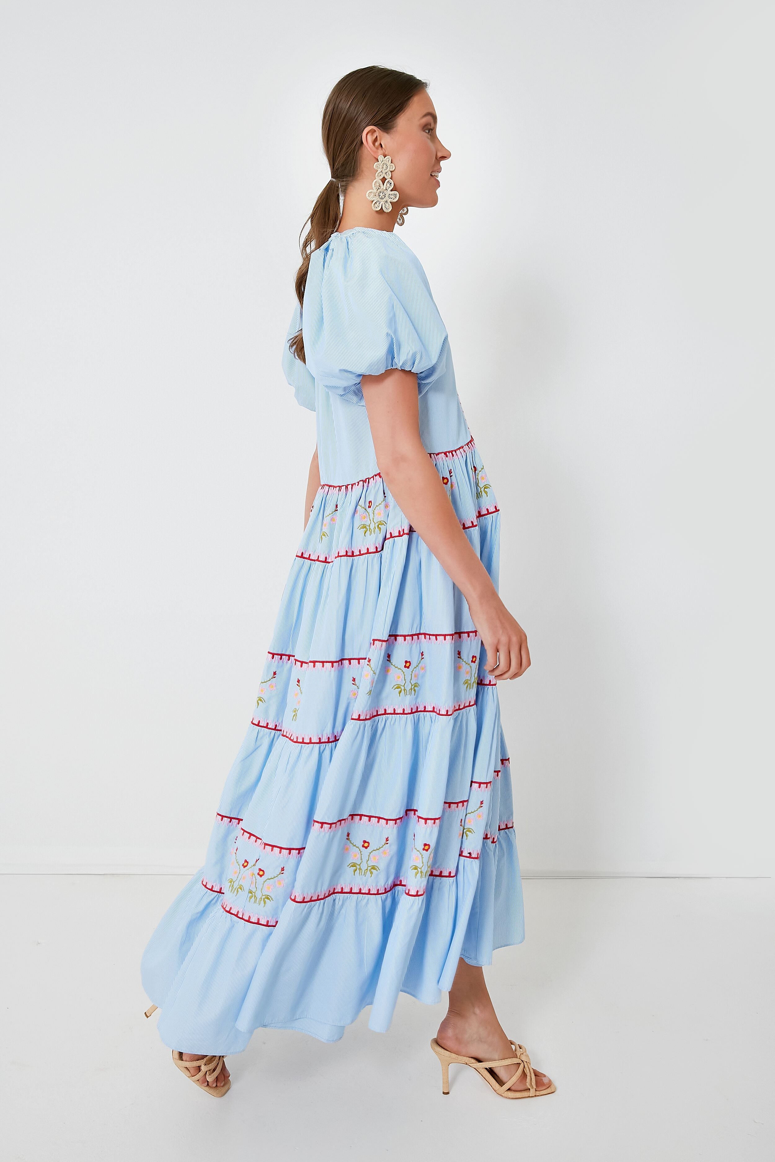 Featuring a classic pinstripe. delicate embroidery. tiered silhouette and puff sleeves. the Lillian Dress is sure to be a style you reach for time and time again. Pair with raffia heels and a clutch for an outdoor wedding. or dress down with flat sandals and a crossbody for brunch with the girls. No matter how you style it. this chic maxi is guaranteed to gather compliments!