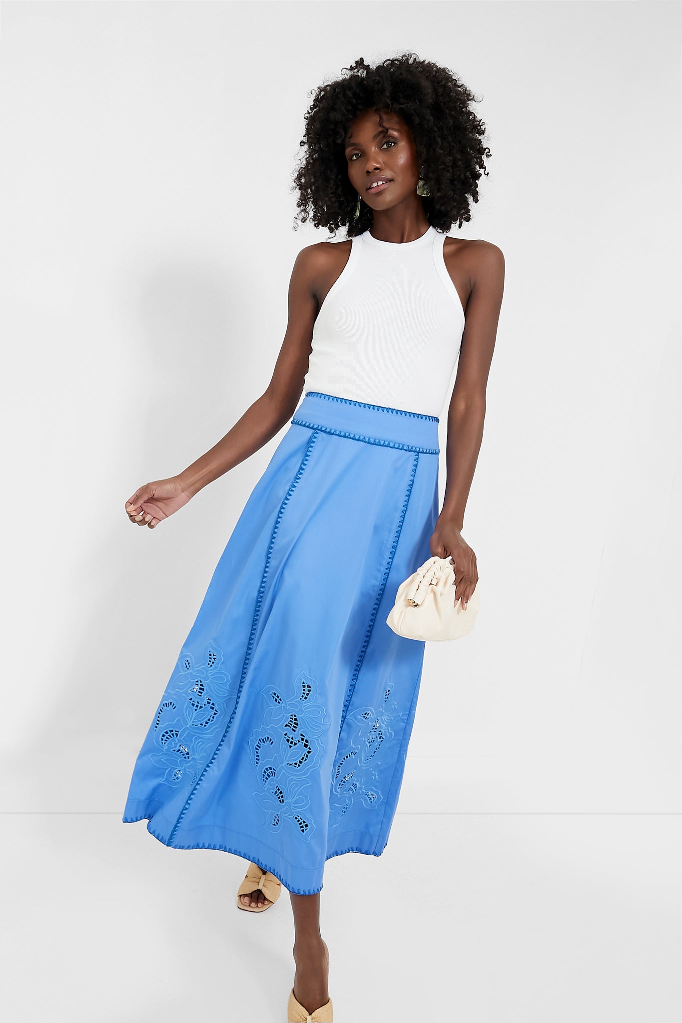 The Blue Rosalie Skirt is a vibrant midi that can complement an eclectic outfit or serve as the piece de resistance. With a wide hem. A-line silhouette. and embroidered detailing throughout. this cheerful style is elegantly eye-catching. Pair with espadrilles and a white tank for a timeless look. or with a colorful top and statement earrings for playful ensemble.
