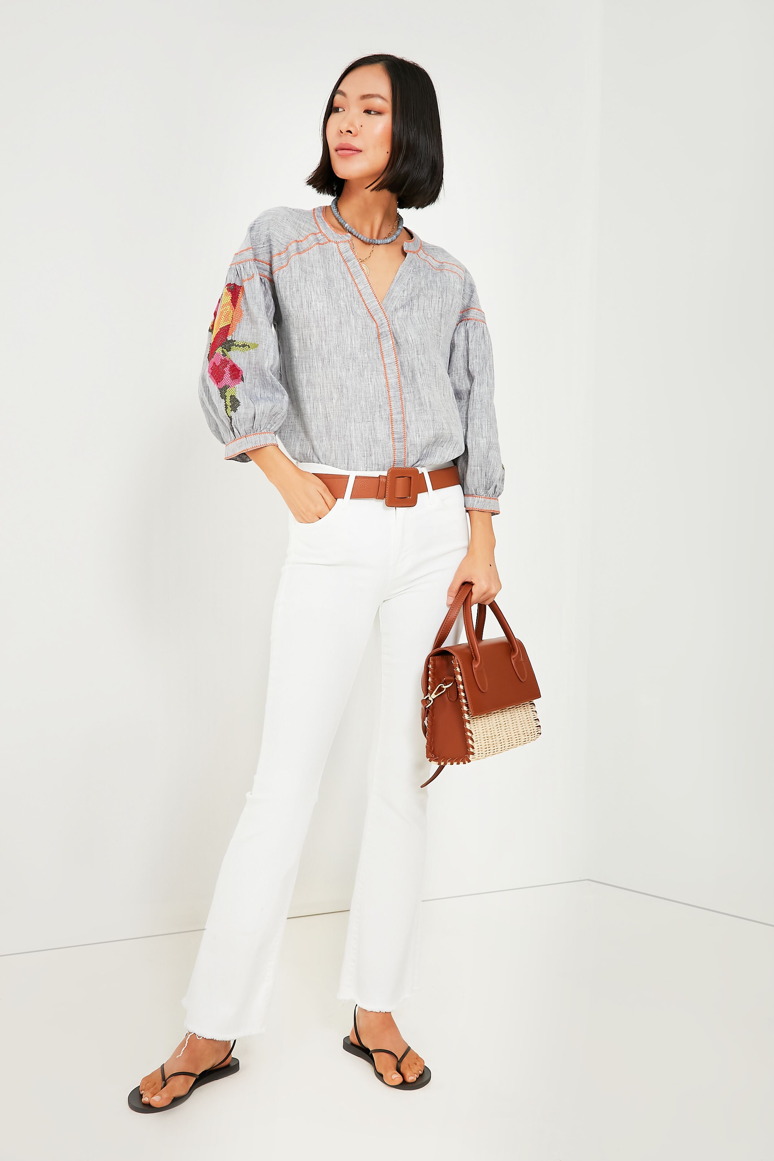 Made from crisp blue linen. the Blue Rufous Blouse is warm weather ready. Designed with contrast stitching throughout and colorful embroidered floral motifs. this top is truly special. Finished with three-quarter length puff sleeves. a hidden button front. and a breezy fit. this silhouette will keep you moving and grooving even as the temperature soars. From cut offs to wide leg denim. we are pairing this boho blouse with bold accessories and sandals for the perfect summer look.