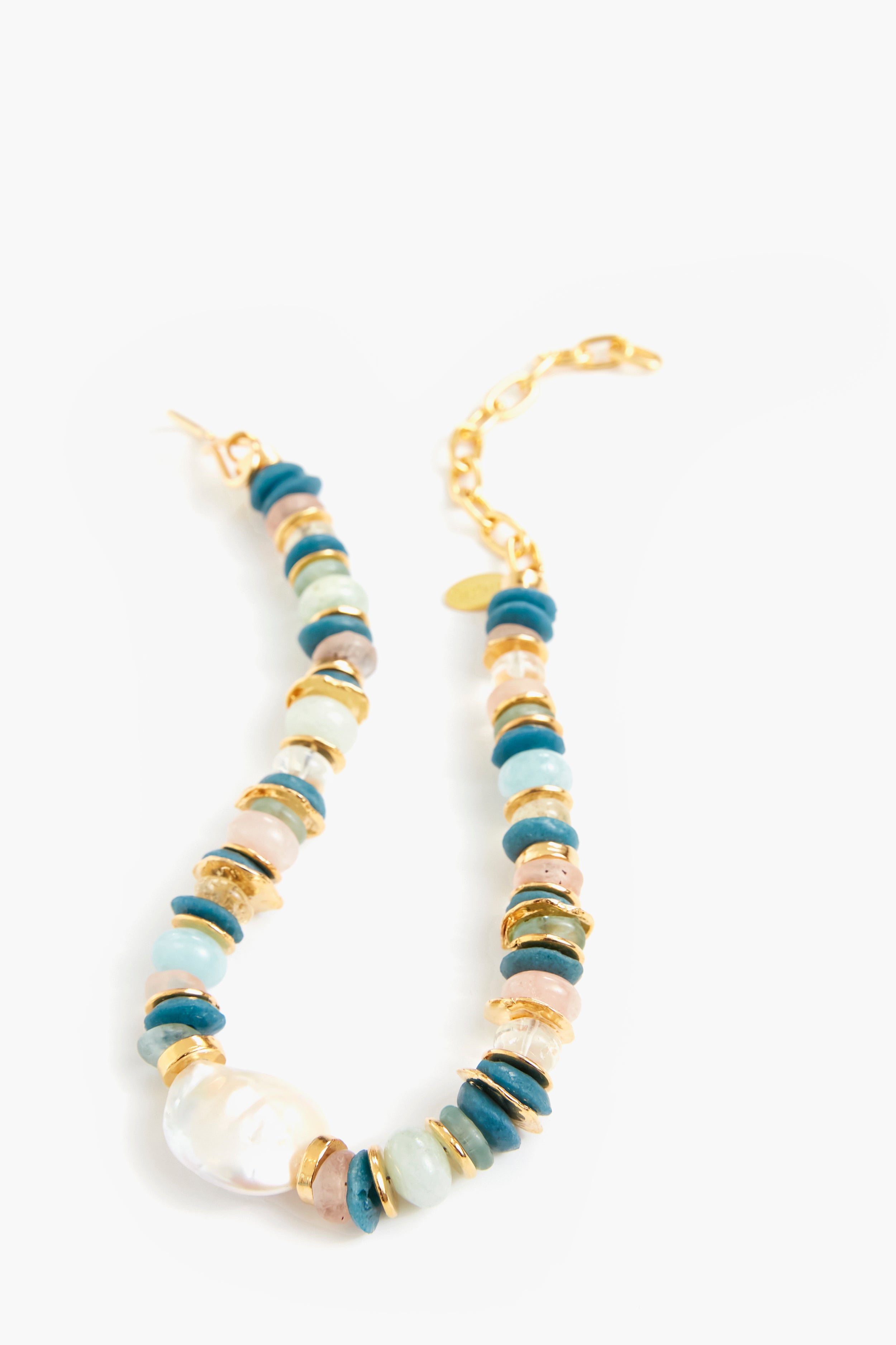 The Blue Starlight Collar is a single-strand necklace crafted from Baroque pearls. recycled glass beads. semi-precious stones. and gold discs.Elevate jeans and a tee or make a splash by pairing this style with cocktail attire!