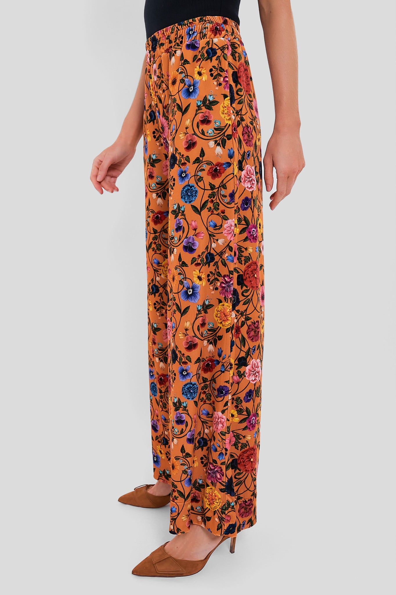 The Botticelli Rust Velvet Pallazzo Pants sits on the waist and fall flared. with a wide. breezy fit through the legs – like a skirt. but with the comfort of pants. Boasting a chic and timeless print. pair with the Bourdeaux Solid La Scala Top with Feathers for a look suited for making an entrance. or style with a tee or sweater when you want more excuses to wear them!