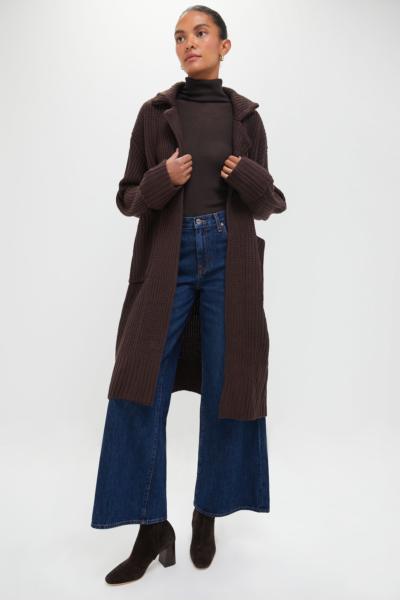 Designed for a relaxed. easy-wearing fit. the Brown Coatigan features a cable-knit texture with a notched collar. long sleeves with oversized cuffs. and patch pockets. We recommend wearing it anywhere and everywhere: in the office. on your next coffee date. running errands around town. or lounging at home.