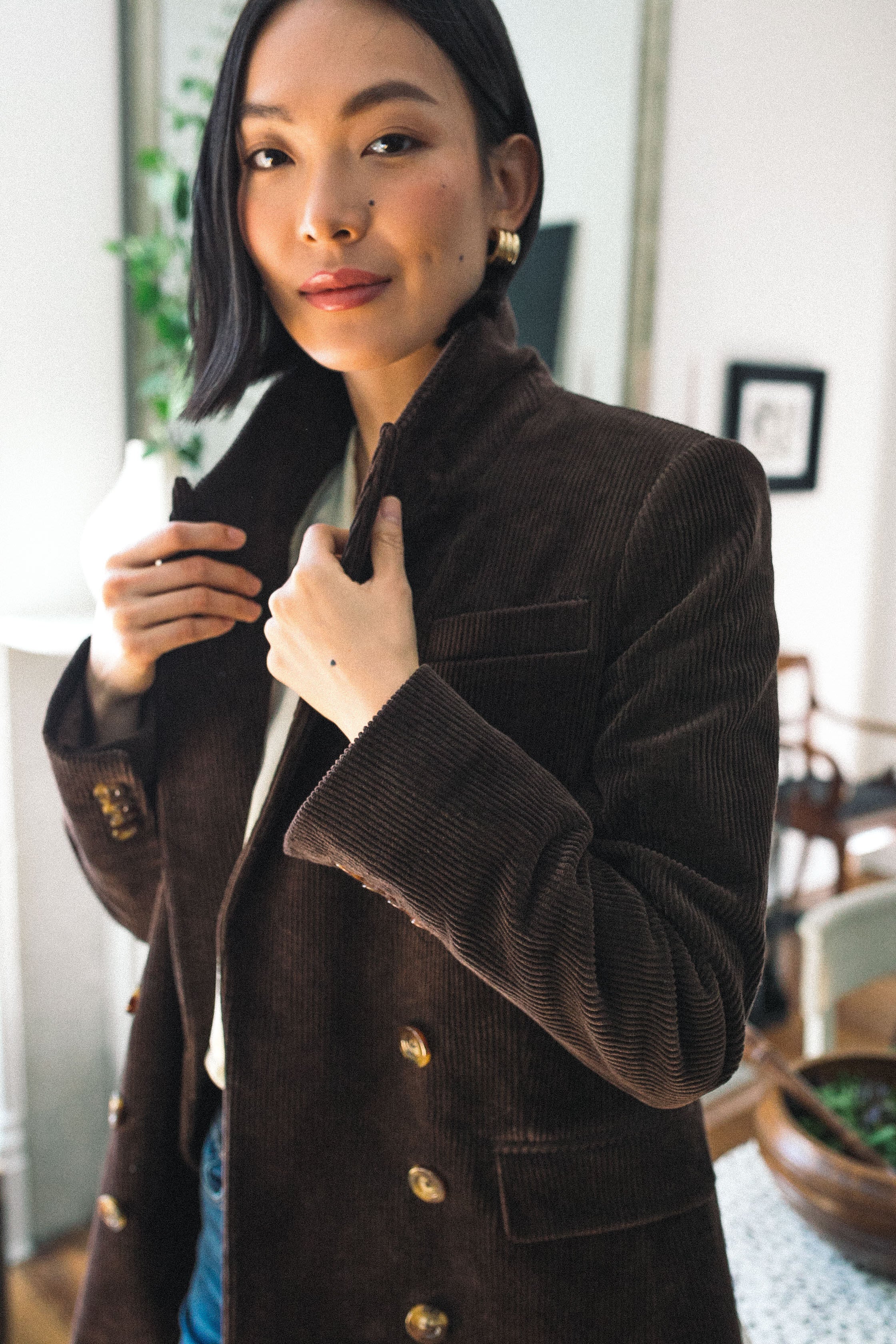 There is nothing better than the Brown Alexander Blazer with its equestrian-meets-prep vibe that's perfect for cooler weather. Made from corduroy in a luxe chocolate color. this chic double-breasted style features peaked lapels. tortoise-shell buttons. and a modern mid-hip length you're sure to love. Pair this elevated outerwear with the matching Ashford Pants for a coordinated look. or layer it over a tee or bodysuit and grab your go-to denim for an effortlessly cool ensemble.
