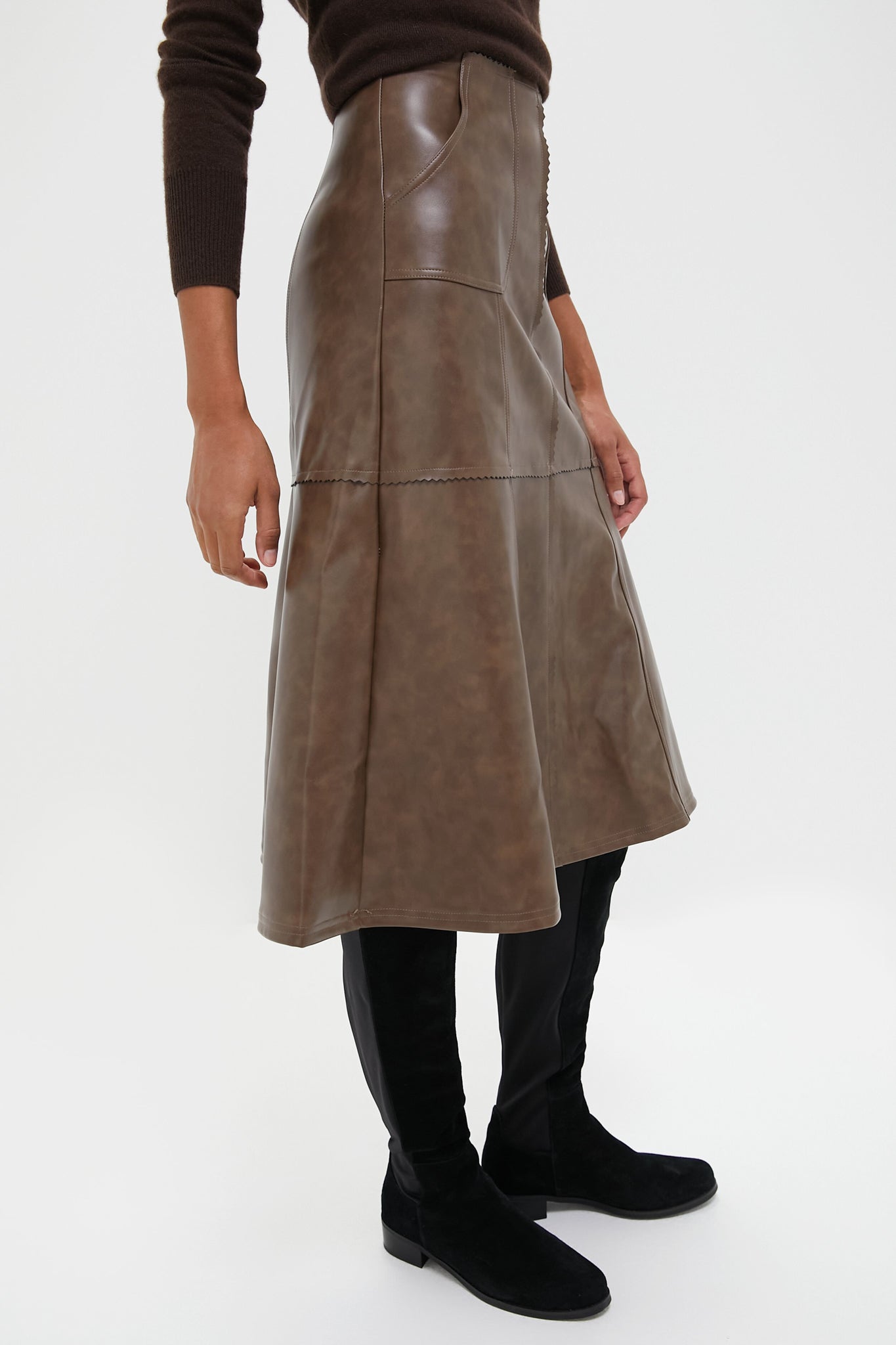 The Maddelena Skirt is a luxe style made from a smooth faux leather. The A-line midi features large patch pockets and seam detailing that elevate the sleek silhouette. Pair with boots and a sweater or a button down and ballet flats for an elevated ensemble!