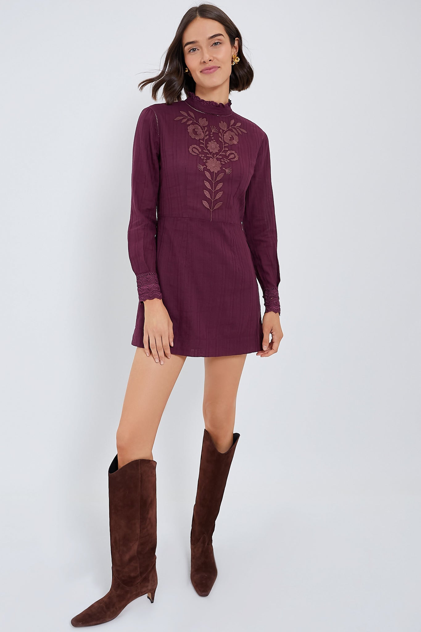 Subtle details go a long way on this Burgundy Kiss Mini Dress — its ruffled collar. blouson sleeves with lace cuffs and delicate embroidery giving it an extra special touch you're sure to love. Style with wedges and a clutch for an al fresco dinner party. or with boots and hat to visit a winery.
