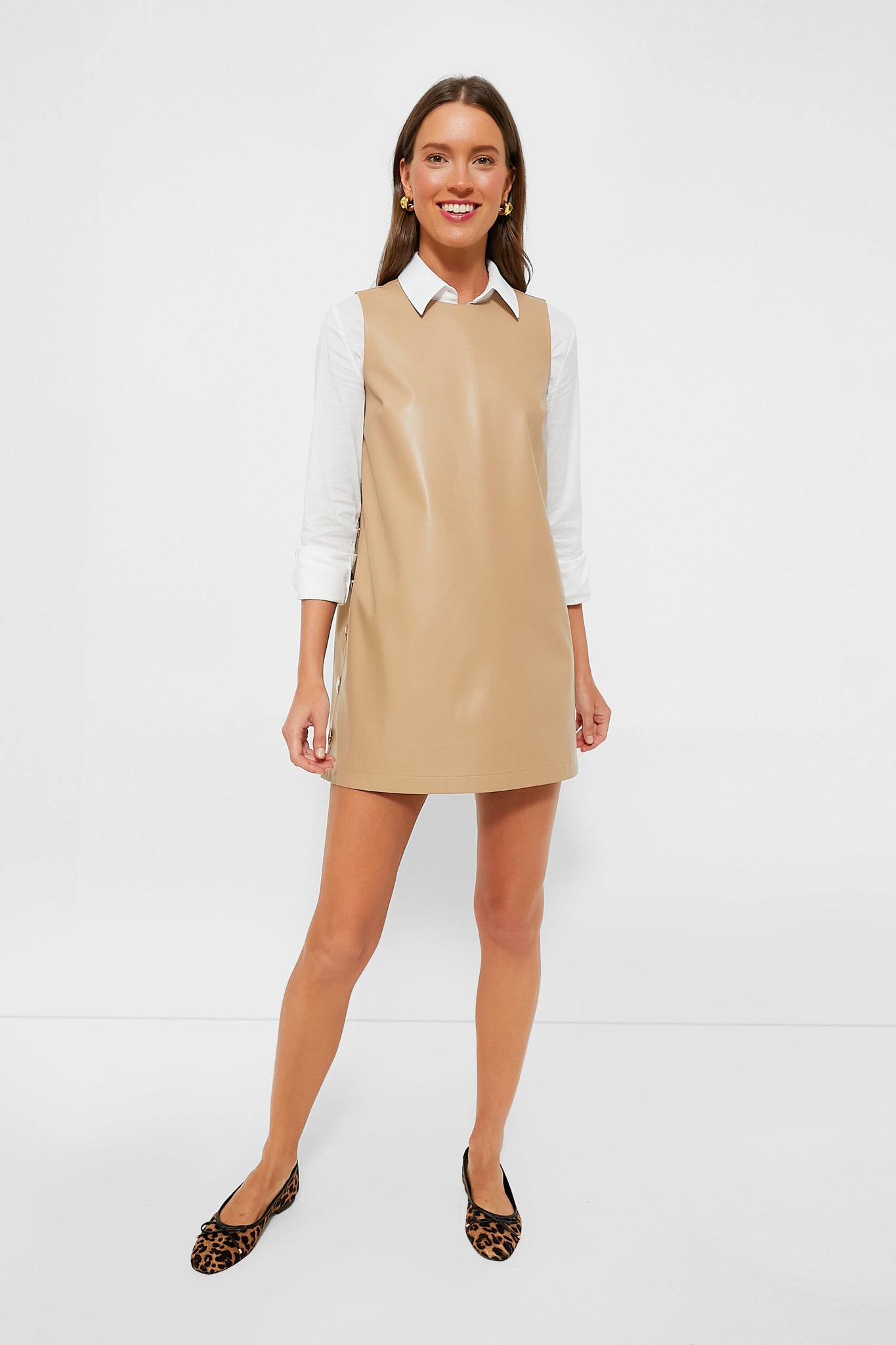The Butterscotch Bitsy Swing Dress is a chic. eye-catching number. Crafted from a slick faux leather. this sleeveless mini features a round neckline and gold button detailing on the side for a classic silhouette with a twist. The perfect transitional. wear-anywhere piece for your closet. we are styling this beauty over a crisp button down and flats for everything from the backyard to the boardroom.