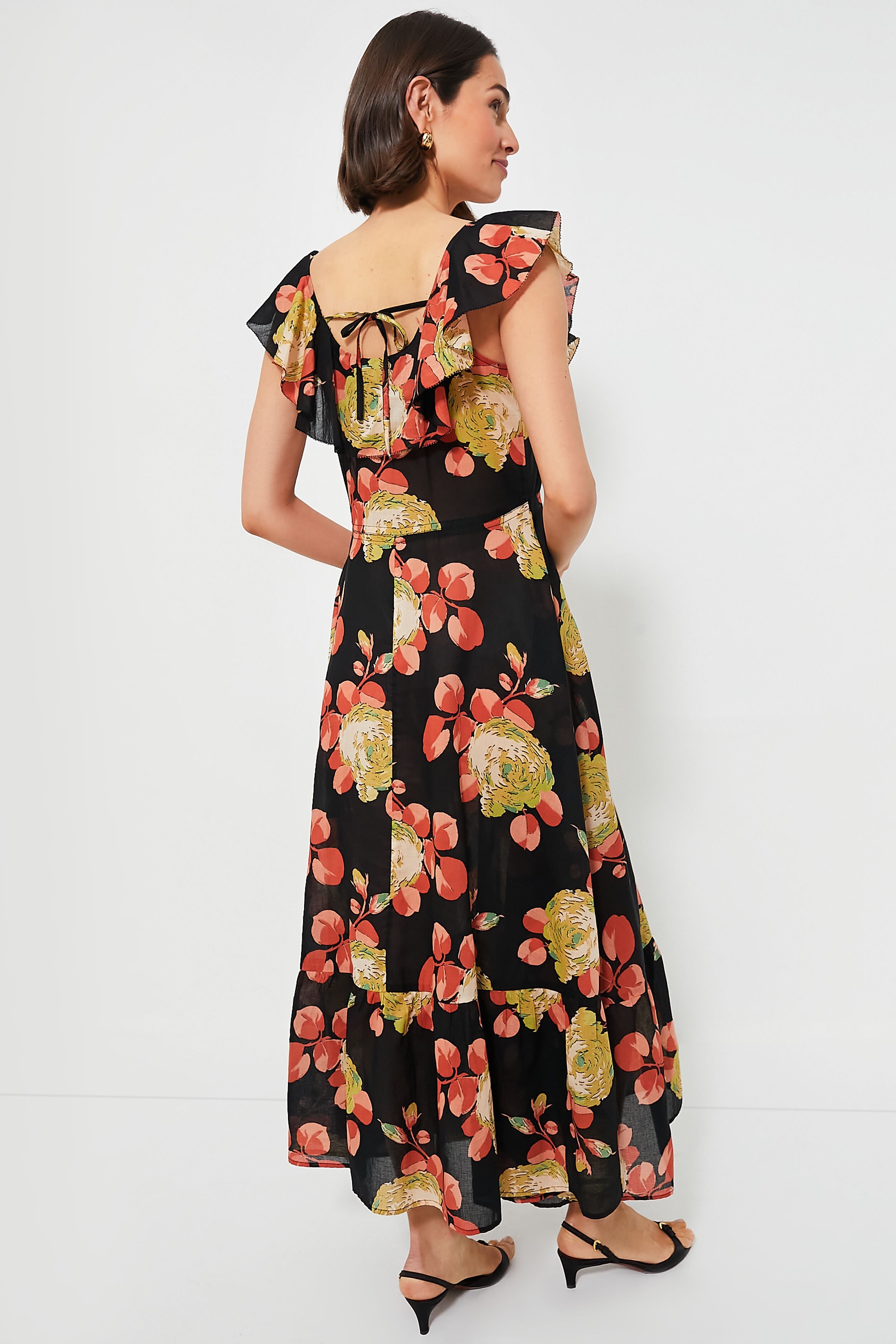 The Cabbage Rose Print The Geranium Dress is brimming with romantic details. A sleeveless midi with a romantic ruffle all around the plunging neckline. a scooped back. and an angled empire waist seam. This flattering silhouette fits snug through the bodice with a long tiered. swingy skirt. Pair with strappy sandals or platform heels for a look that is sure to turn heads.
