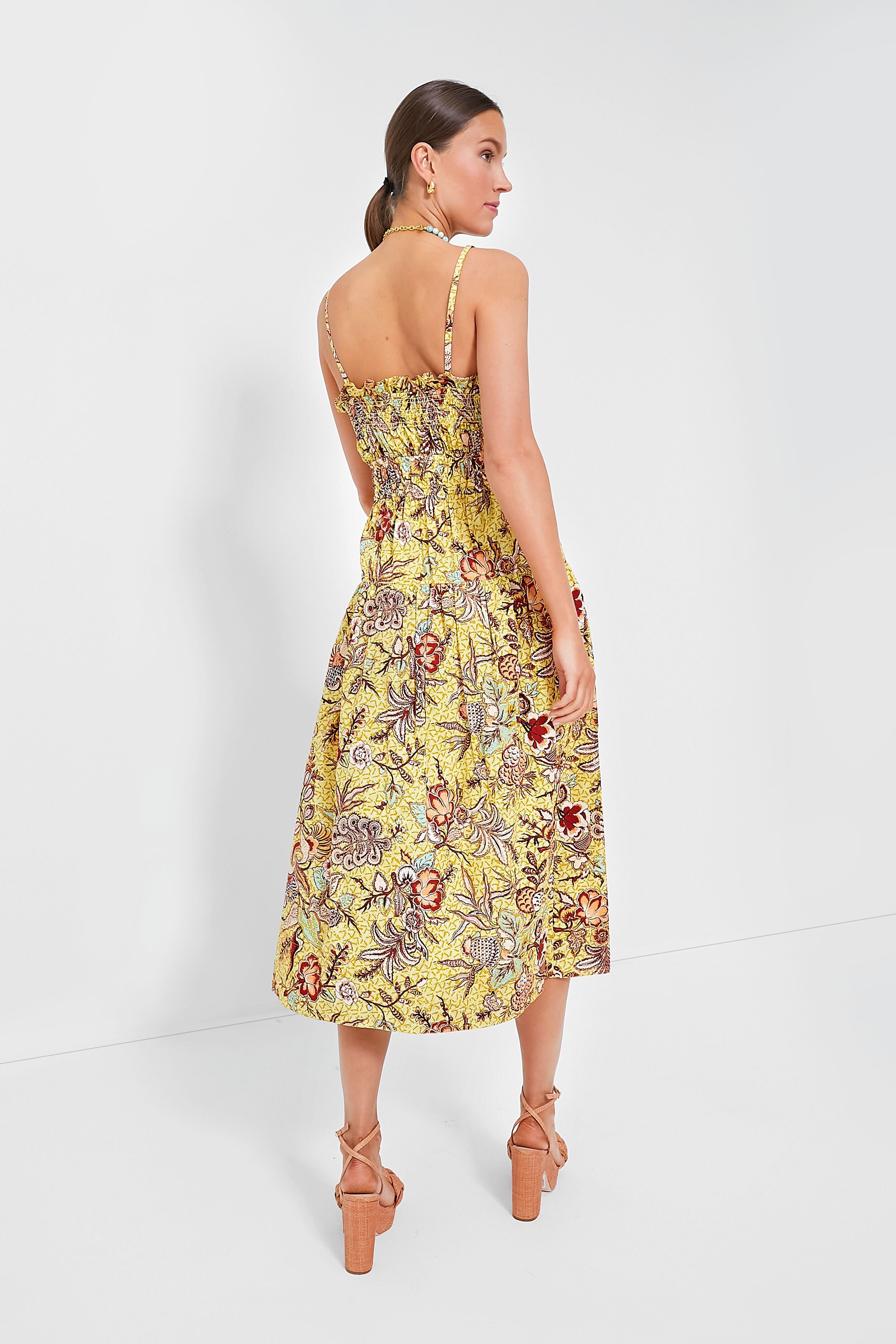 Crafted from floral cotton. the Calla Lily Lisbet Dress is sweet in silhouette with a touch of vibrancy from that breathtaking print. Smocking and ruffled trim add to the charm of this midi. with its square neckline. thin shoulder straps. and adjustable drawstring waist. That stunning shade of buttercream yellow is perfect for warm weather wear. so style it with sandals and gold hoops for brunch. or dress it up with wedges and a clutch for events and occasions!