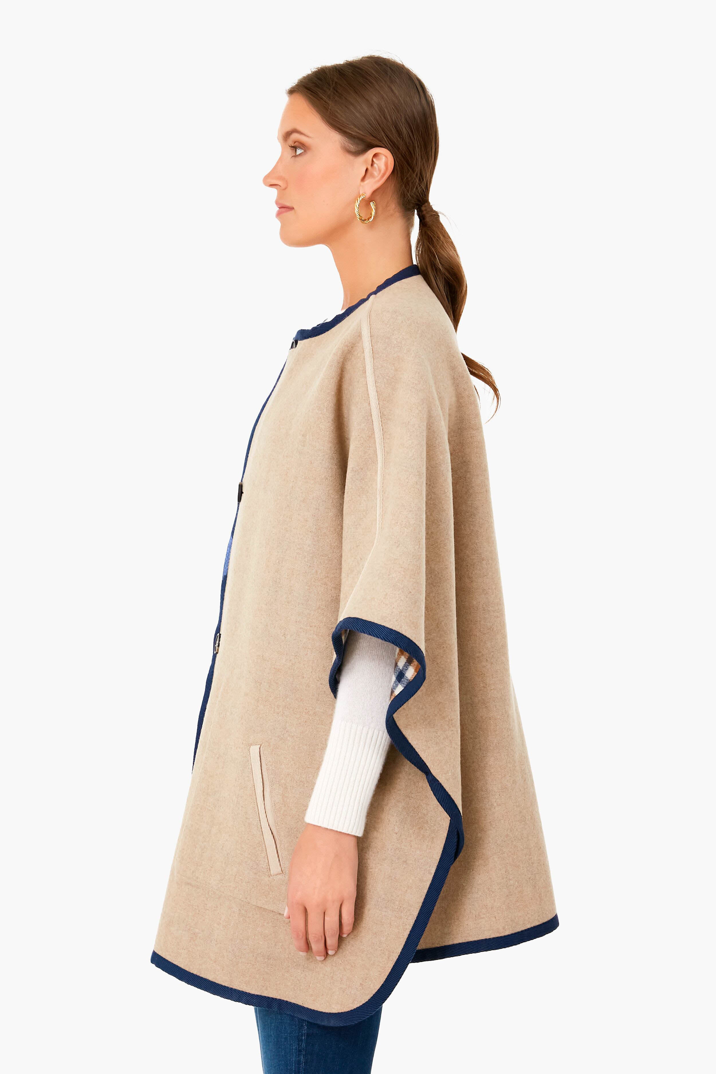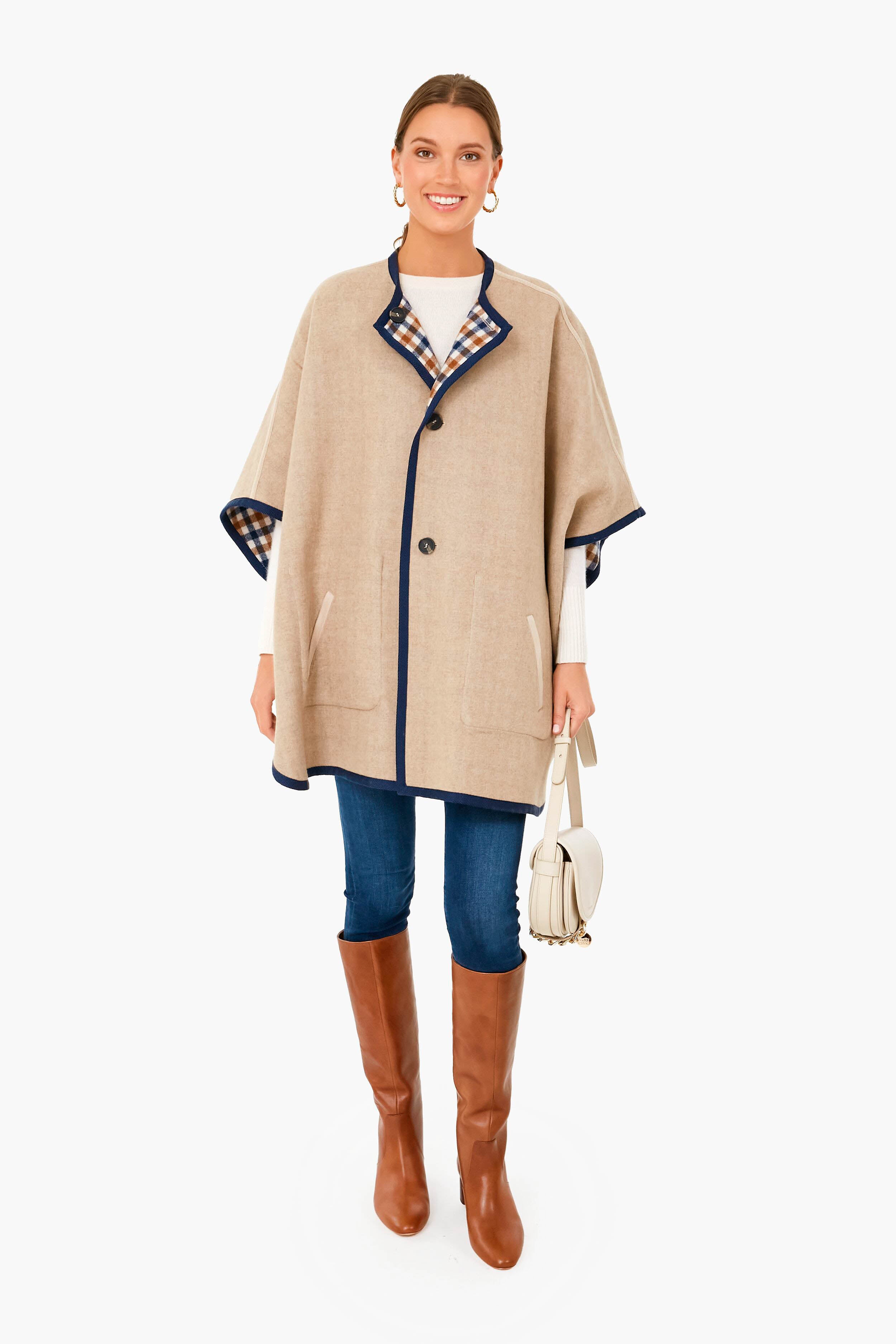 The Camel Fieno Reversible Poncho is the epitome of work smarter not harder. One reversible style can be flipped in two directions to create two unique looks – a plaid side with gorgeous patch pockets. and a solid cream side with chic welt pockets. Contrasting navy trim and a button front add an element of sophistication to this incredible style. Pair this poncho with chunky knits. denim. mini skirts. and leather boots for a quintessential fall fashion look.