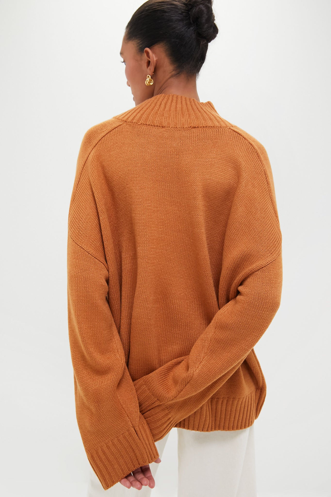 Spun from plush sweater yarns. the Oversized Sweater has a relaxed shape featuring dropped shoulders. a funnel-neck and ribbed trims. In a gorgeous camel color that will take your through the fall season from pumpkin patches to nights around the fire with family. we recommend pairing with denim. ballet flats. and a hobo bag!
