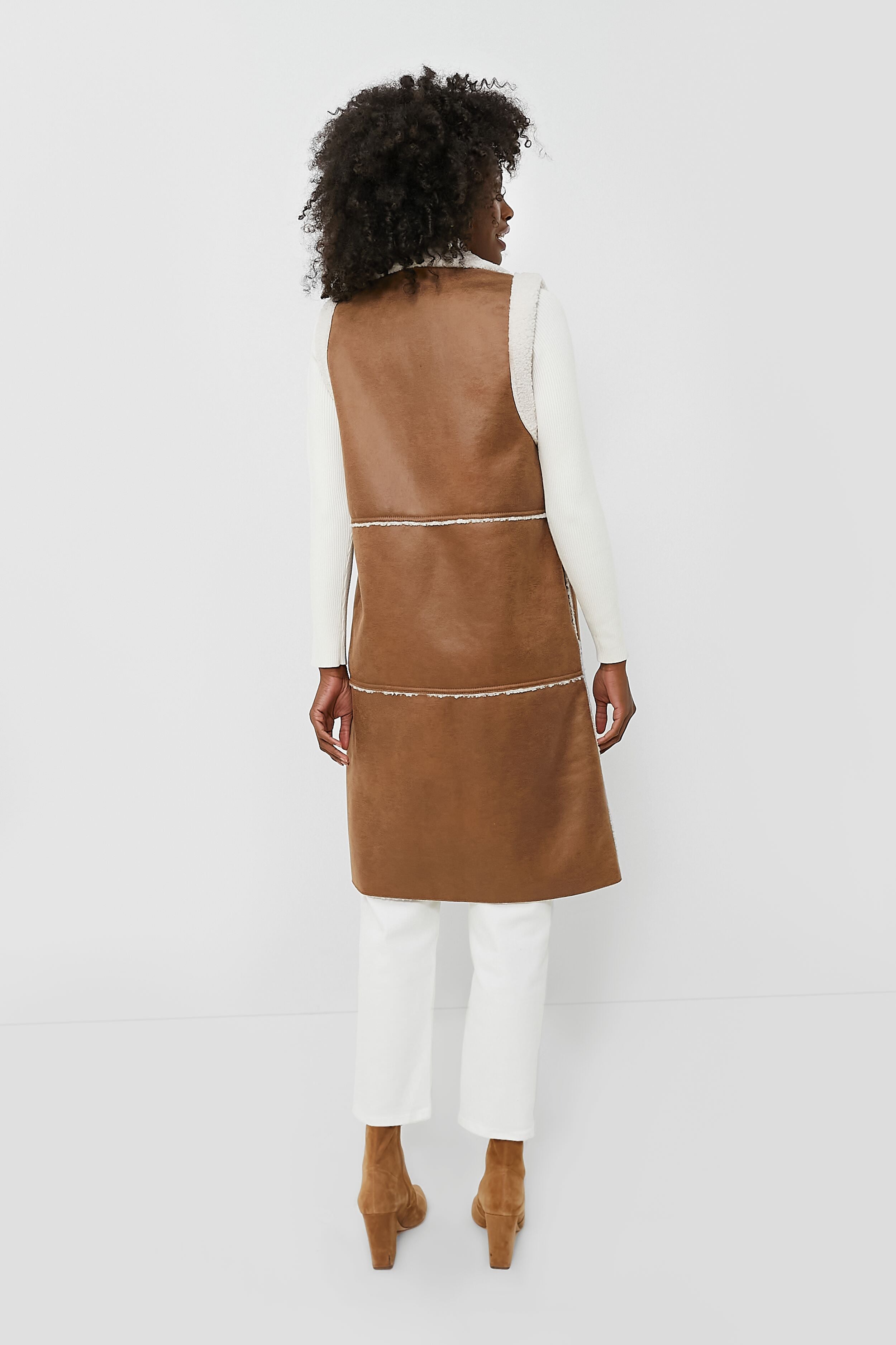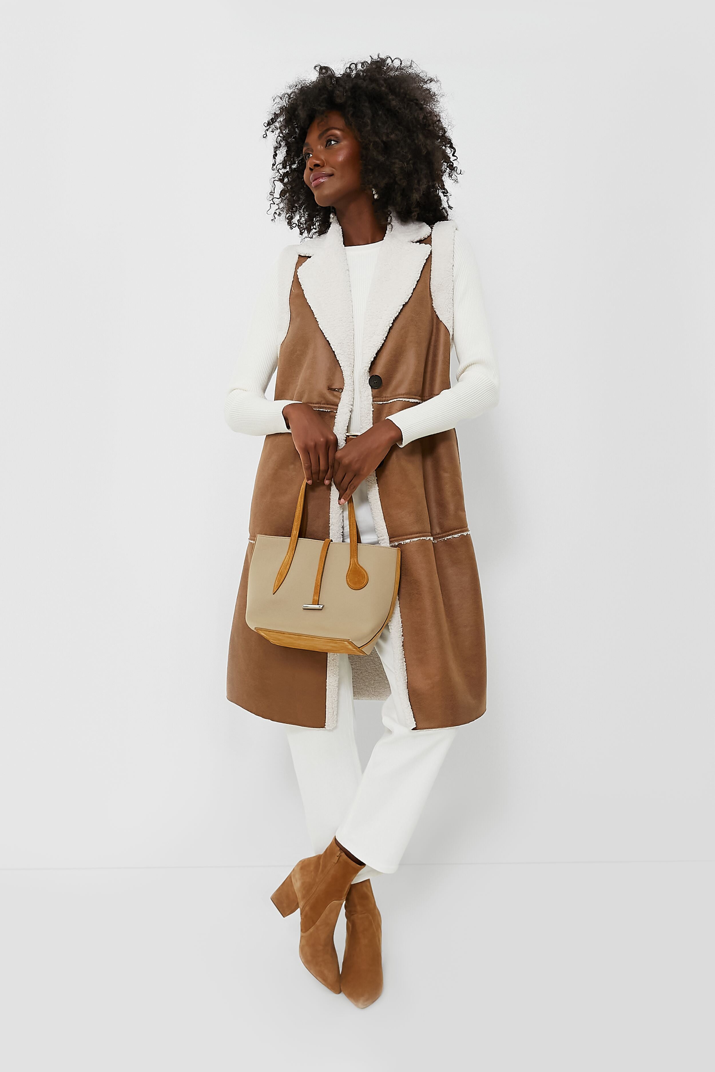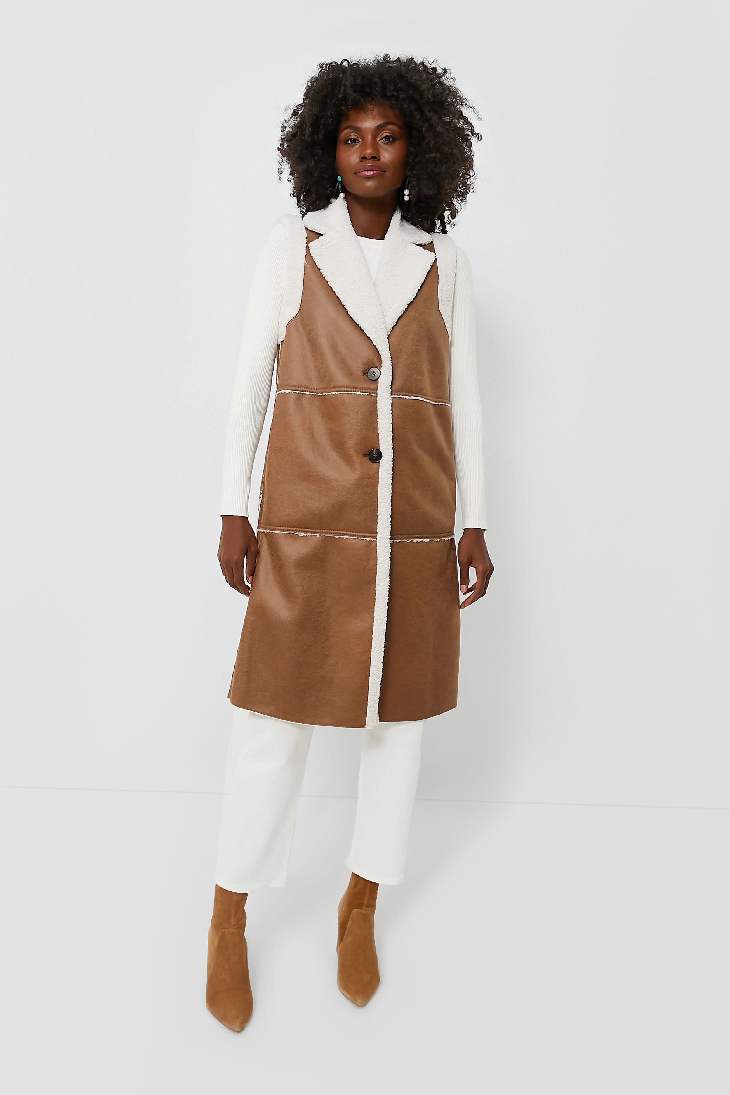 Make a statement when you walk in wearing the Camel Ugola Vest. In rich neutral hues. this long gilet features a faux leather outer and a super soft and cozy sherpa interior made to keep you warm. Polished details like a lapel collar. buttons down the front. and side seam pockets complete the look and add an element of luxury that you just can't replicate. Layer it over a long sleeve tee or a turtleneck for fall fashion at its finest.