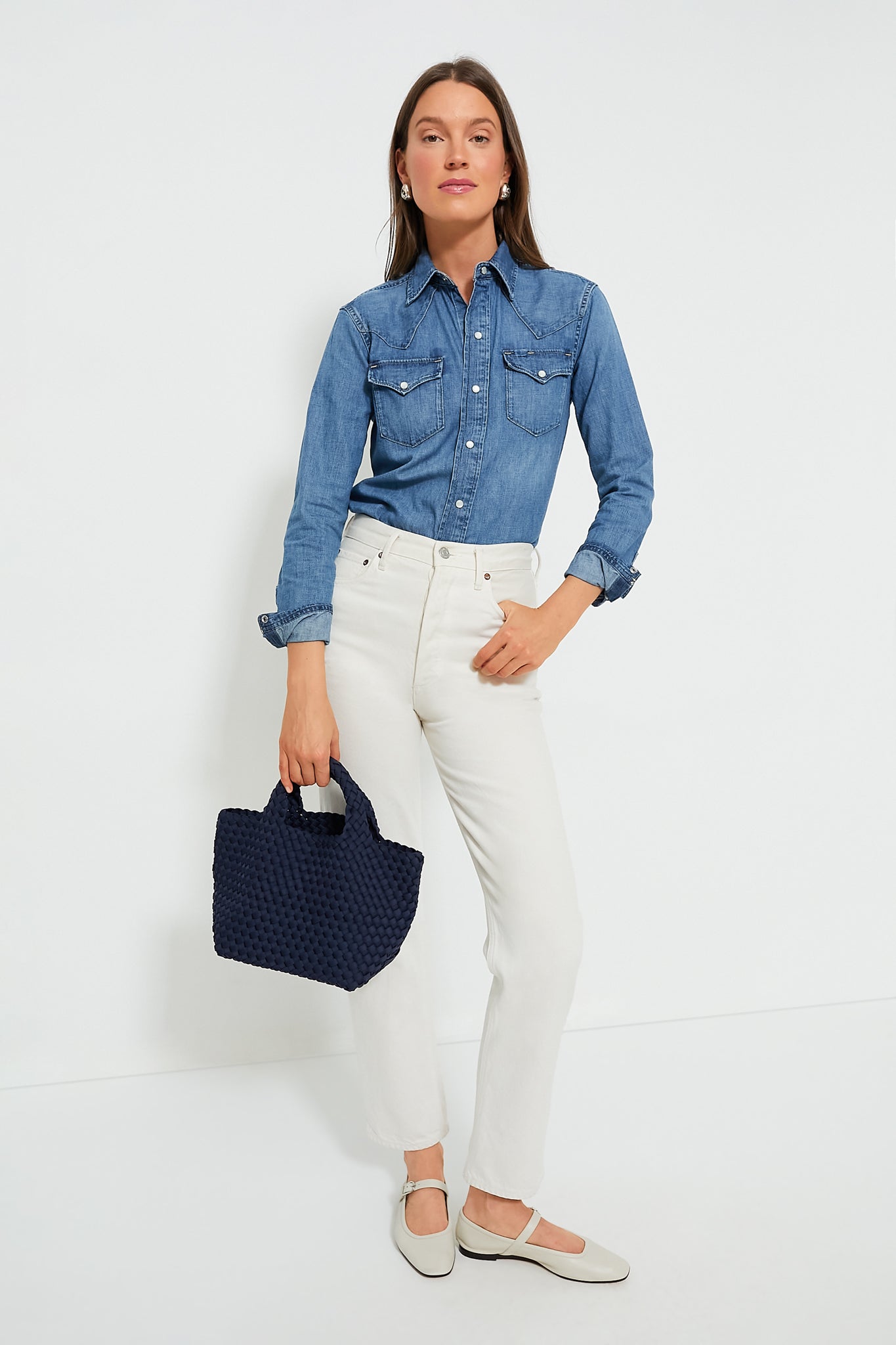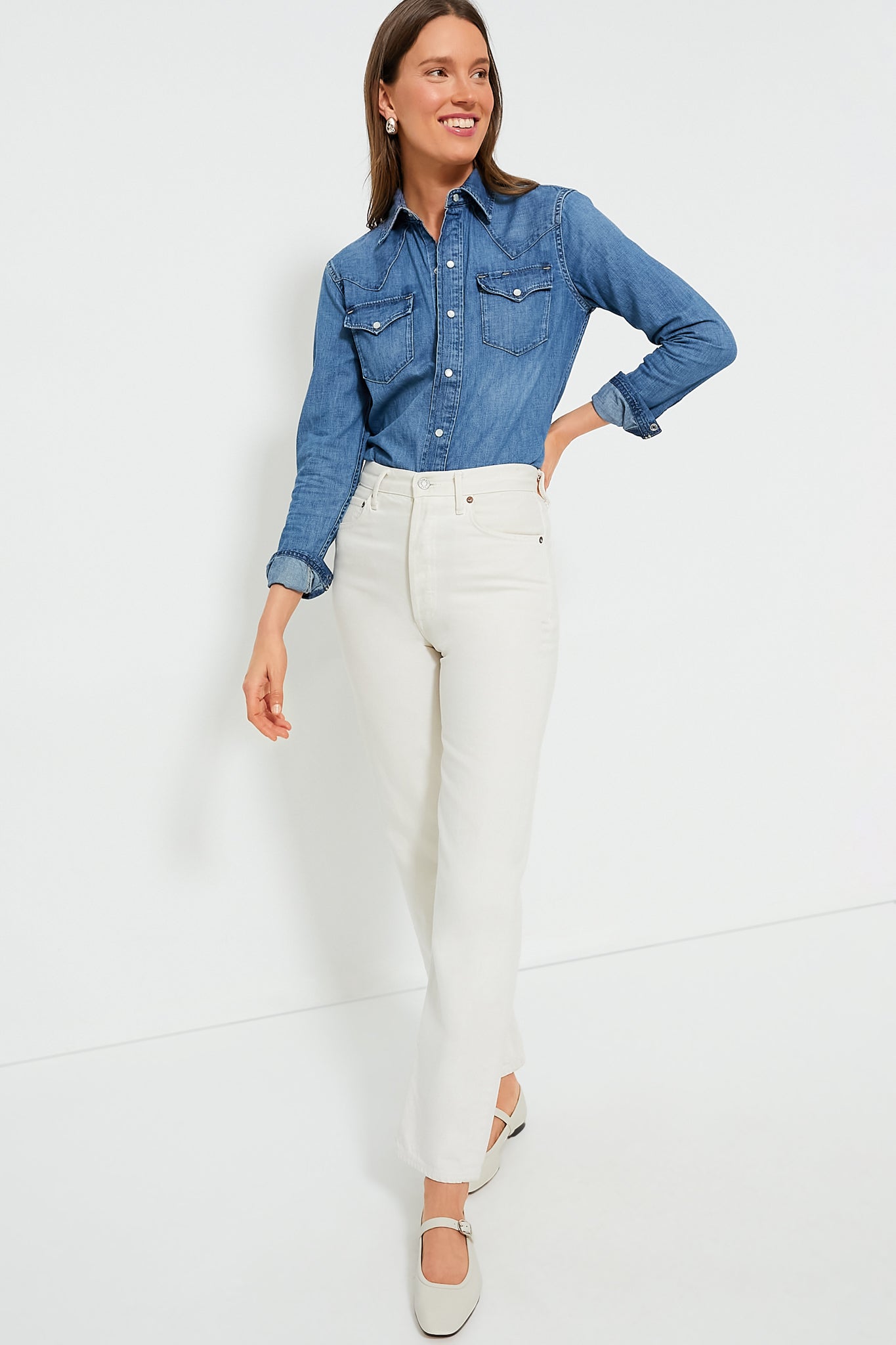 With clean western details and subtle fading throughout. the Canaria Wash Denim Button Shirt feels like the ultimate vintage find. Cut in the perfect length that looks great tucked in or left out. this effortlessly polished piece is great for year round wear thanks to its versatile styling options. Pair with denim and boots for a full coordinating outfit. or with a skirt and sneakers for a casual cool-girl look.