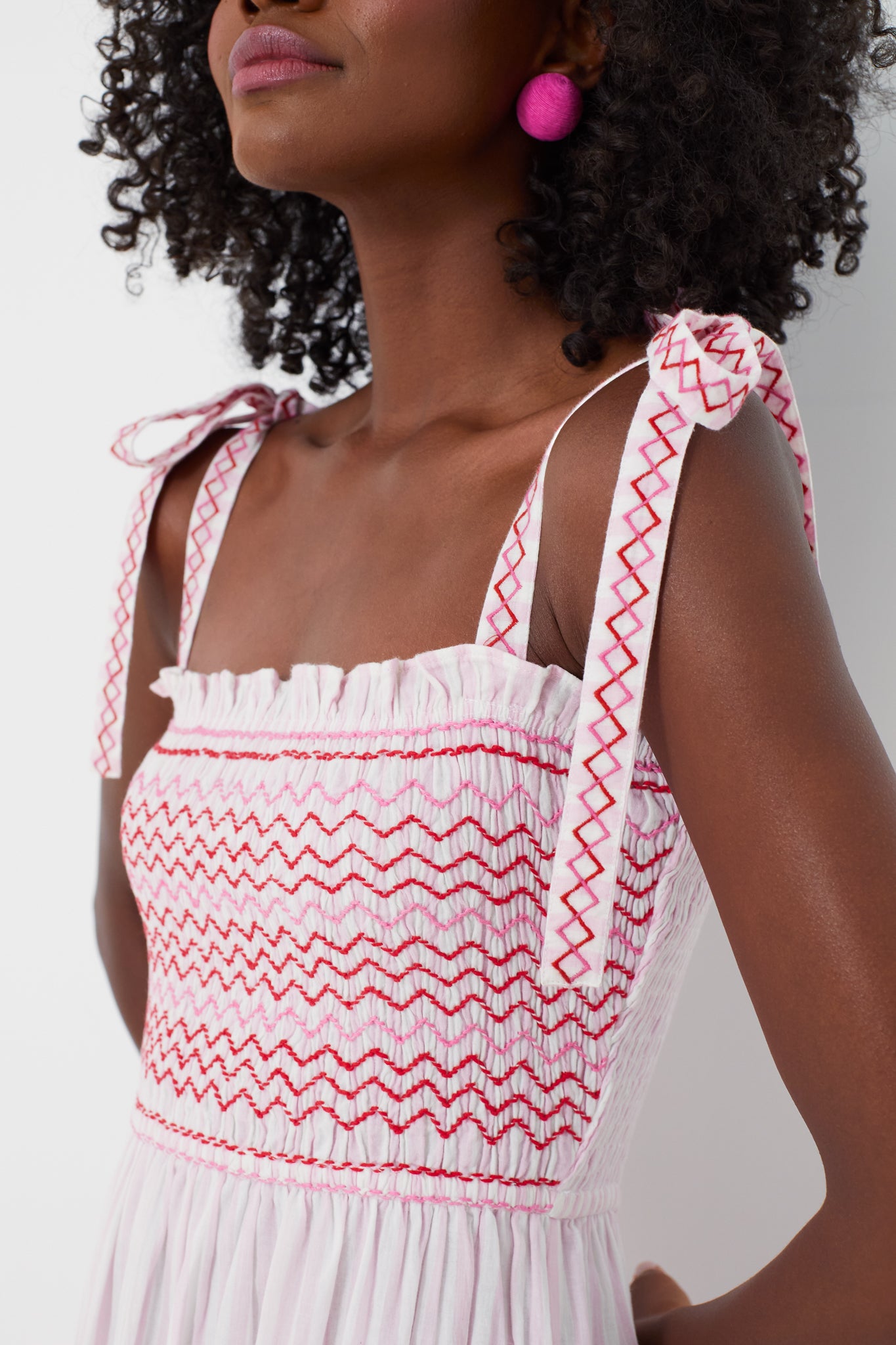 Crafted from soft. hand-loomed cotton in the prettiest shades of pink and white. the Candyfloss Stripe Jessica Dress is a versatile and effortless addition to your spring wardrobe. With a flattering hand-smocked body and embroidered zigzag details throughout. the maxi is finished with adjustable tie straps and a shirred back to create the perfect fit. The fabric has the most beautiful drape and feel. you won't want to take this off!