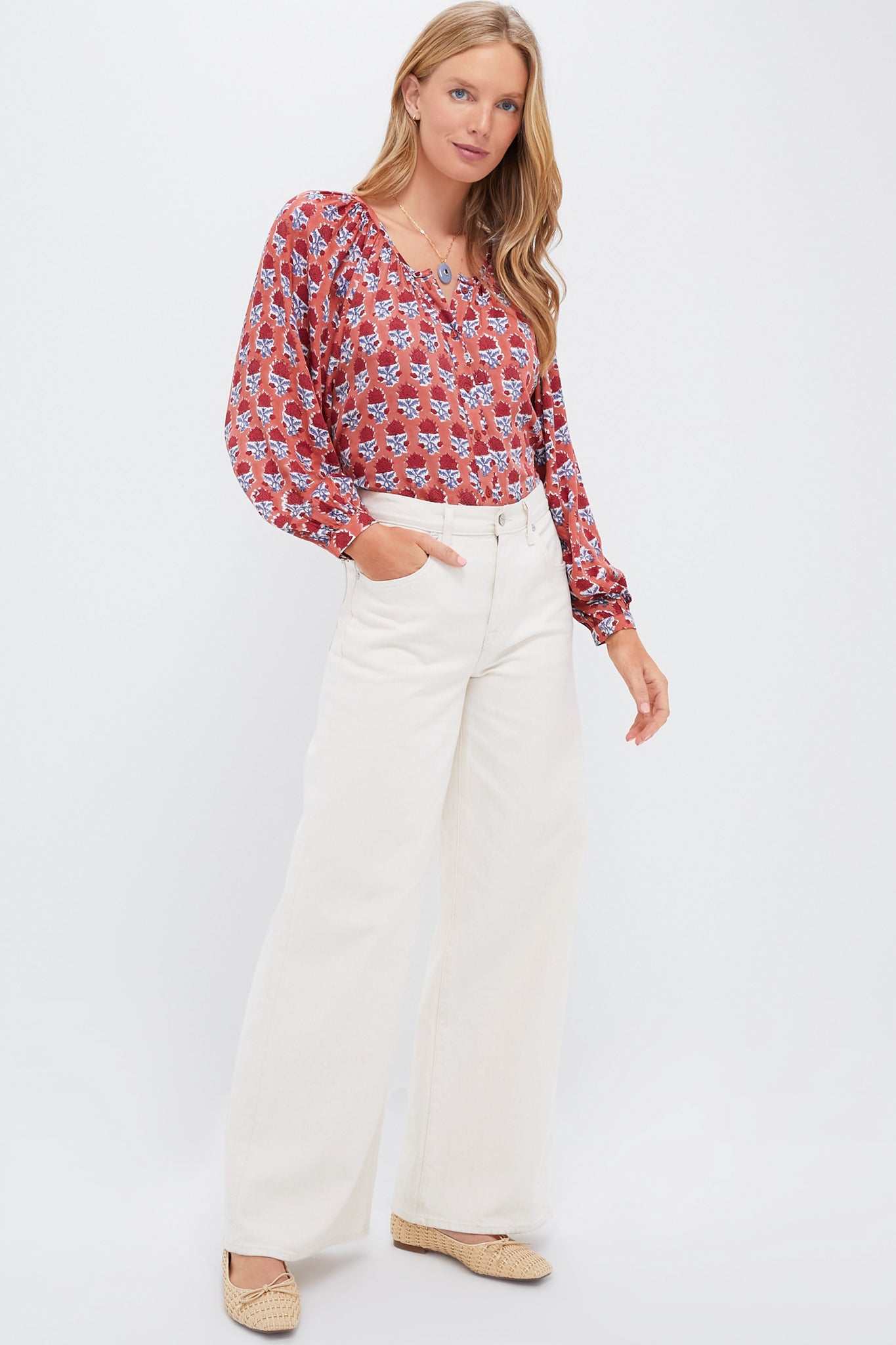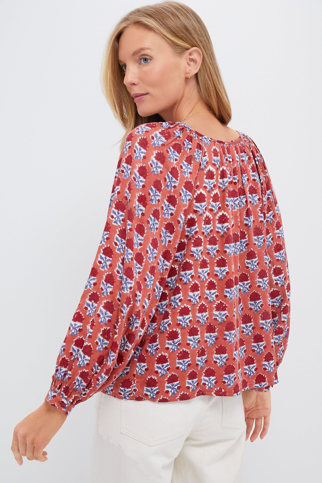 - Long blouson sleeves