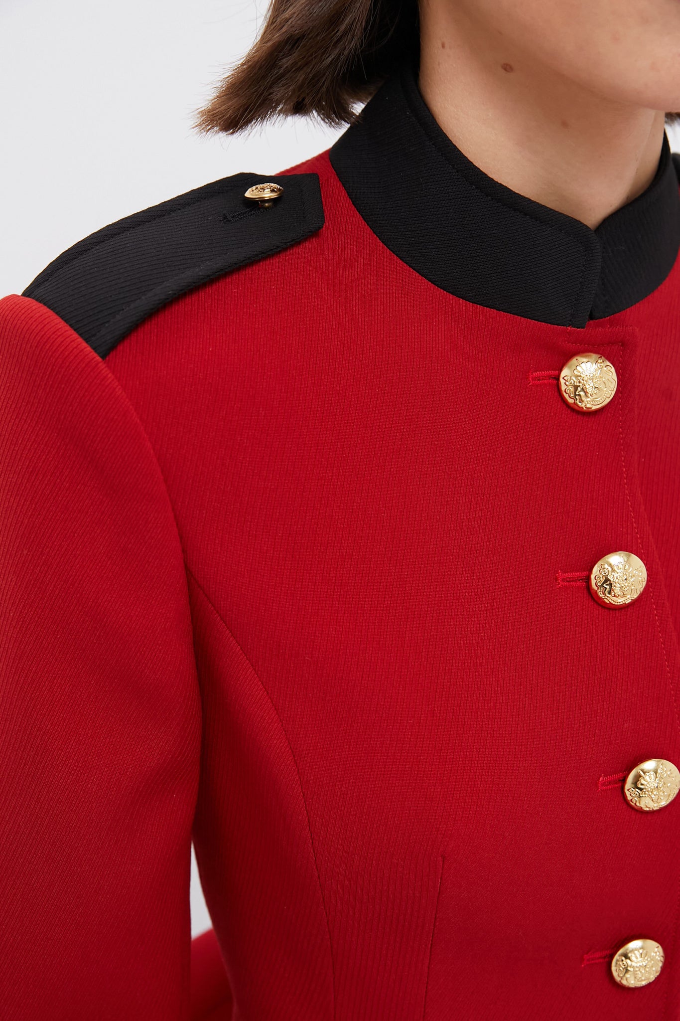 The Ada Jacket is perfect for making a statement this holiday season. Featuring a fit and flare silhouette. a Mandarin neckline. epaulettes at the shoulder. and gold button detailing. this jacket is bound to turn heads. We recommend pairing with a slip skirt or trousers. black heels. and a rhinestoned clutch for the picture perfect party look!