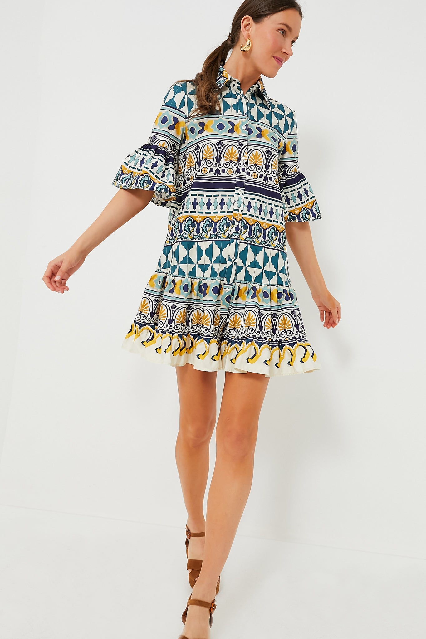 Looking for something smart but sweet. short and neat? Look no further than the Casareale Small Choux Dress. This mini boasts half-length fluted sleeves. a ruffle hem. and a front button placket. Crafted in bouncy cotton poplin in a bold print placed by the finest artisan hands. it is lightweight. breathable and a great in-between season go-to.