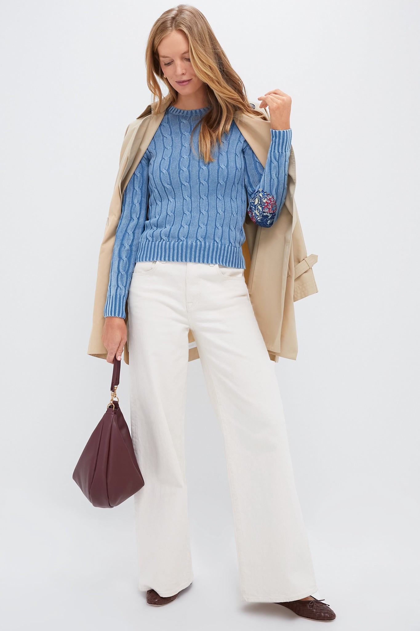 This chic sweater boasts a sophisticated cable knit construction with floral patches embroidered onto the elbows for added fun. The perfect look for everyday activities. pair it with denim or a skirt and ballet flats!
