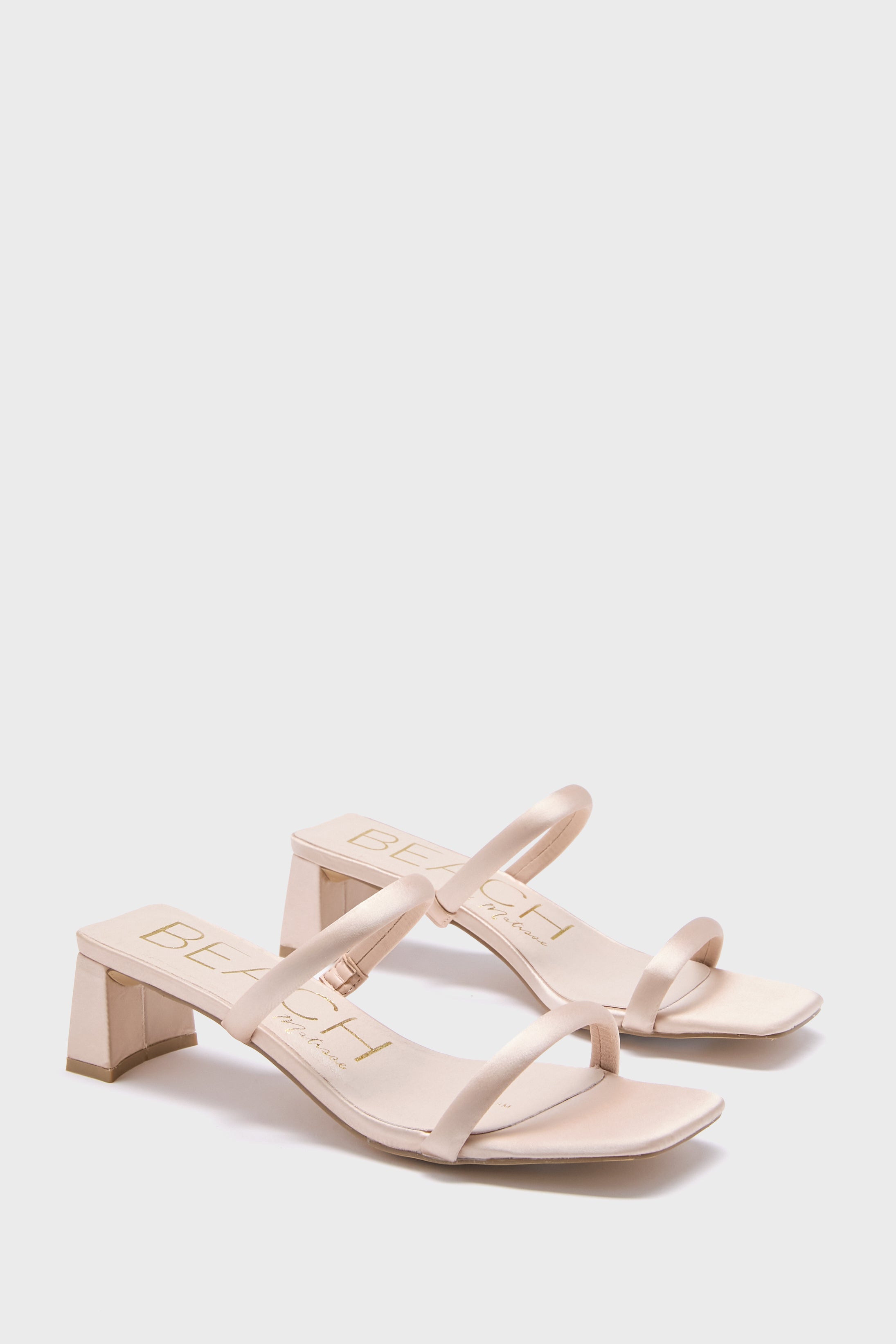 Perfect for work to play. the Champagne Jerry Heels are a chic everyday style. Featuring two upper straps. a slender block heel. and a satin upper. these elegant slip-ons will complement any outfit. Pair with wide leg pants and a button down top or an LBD and shoulder bag.