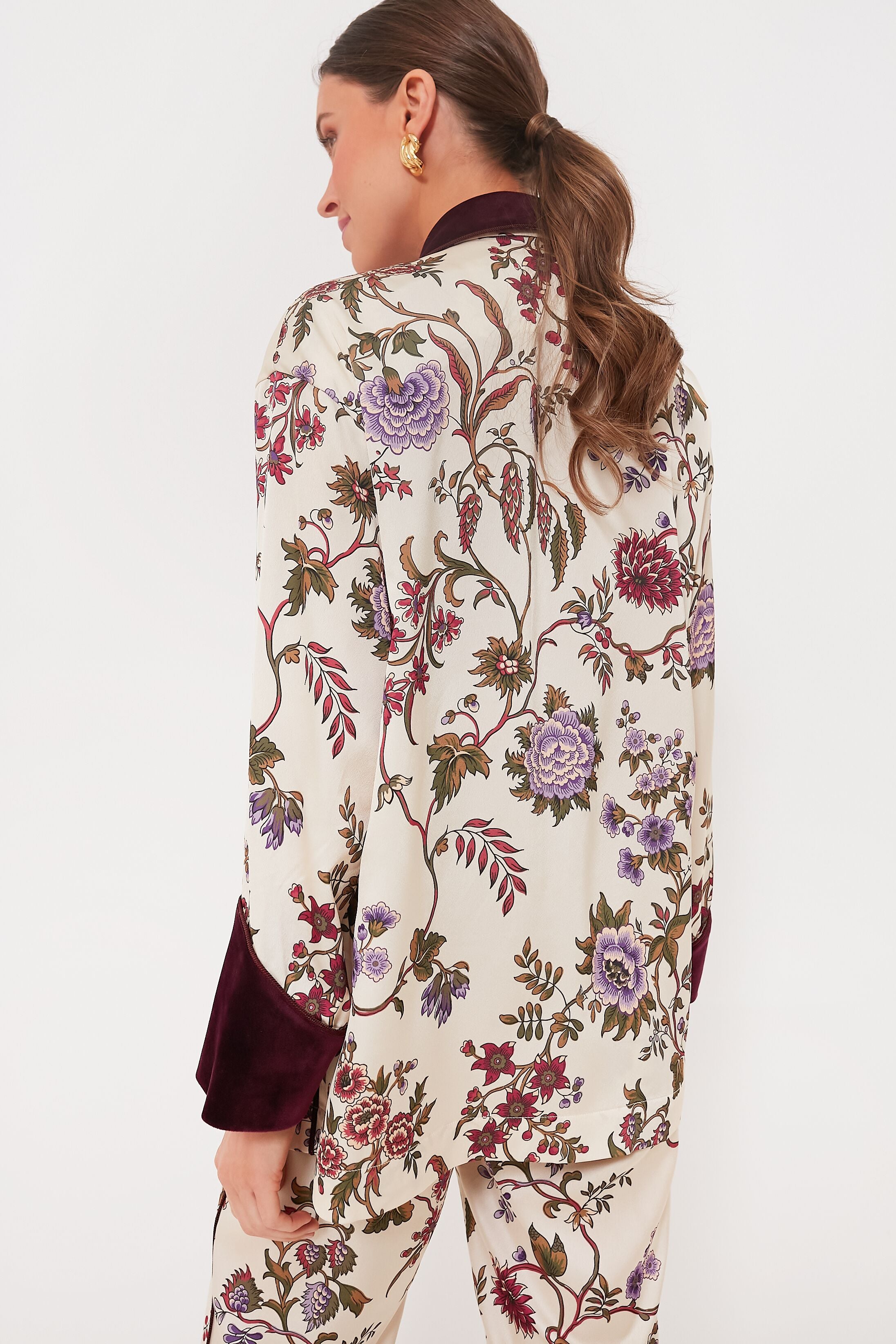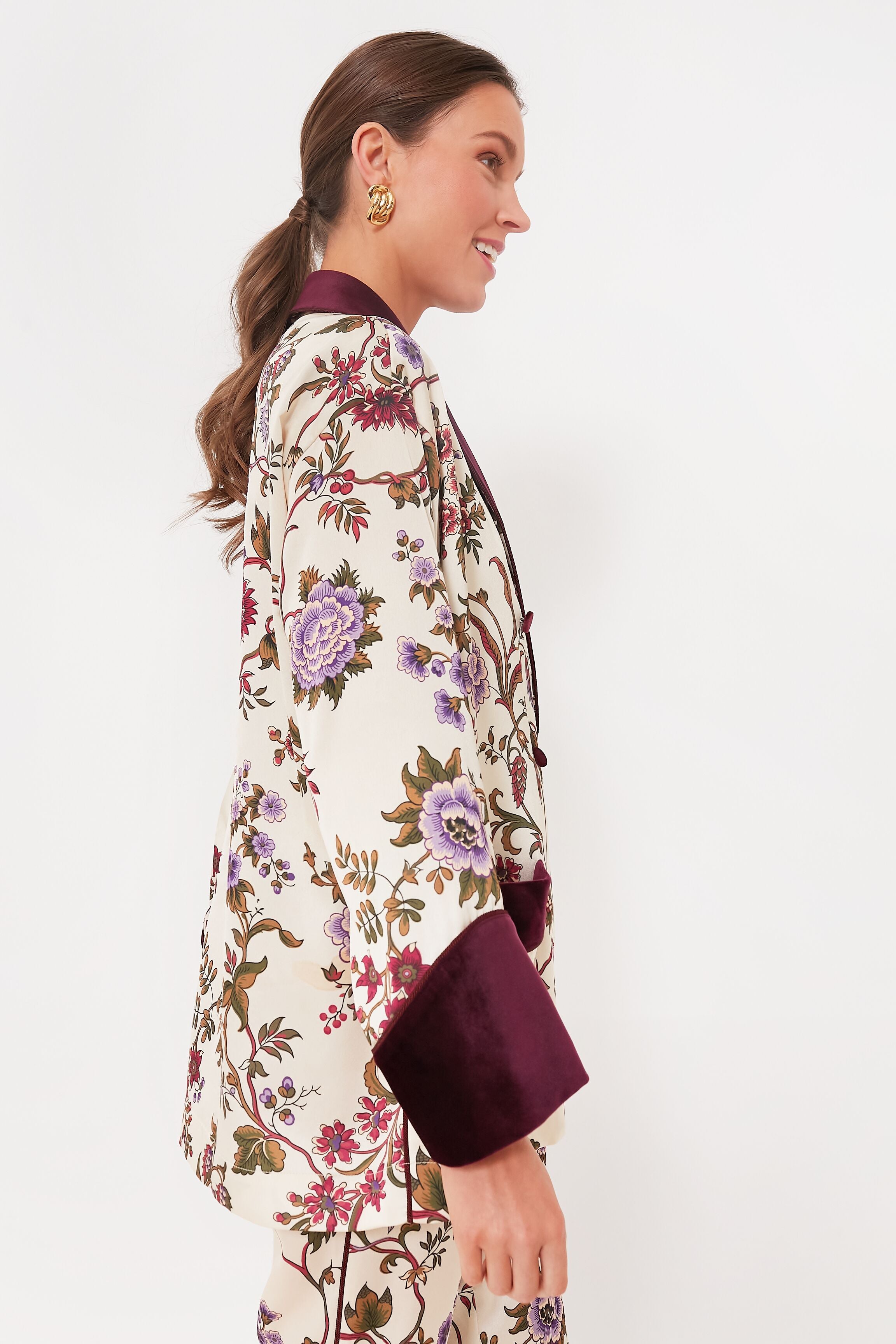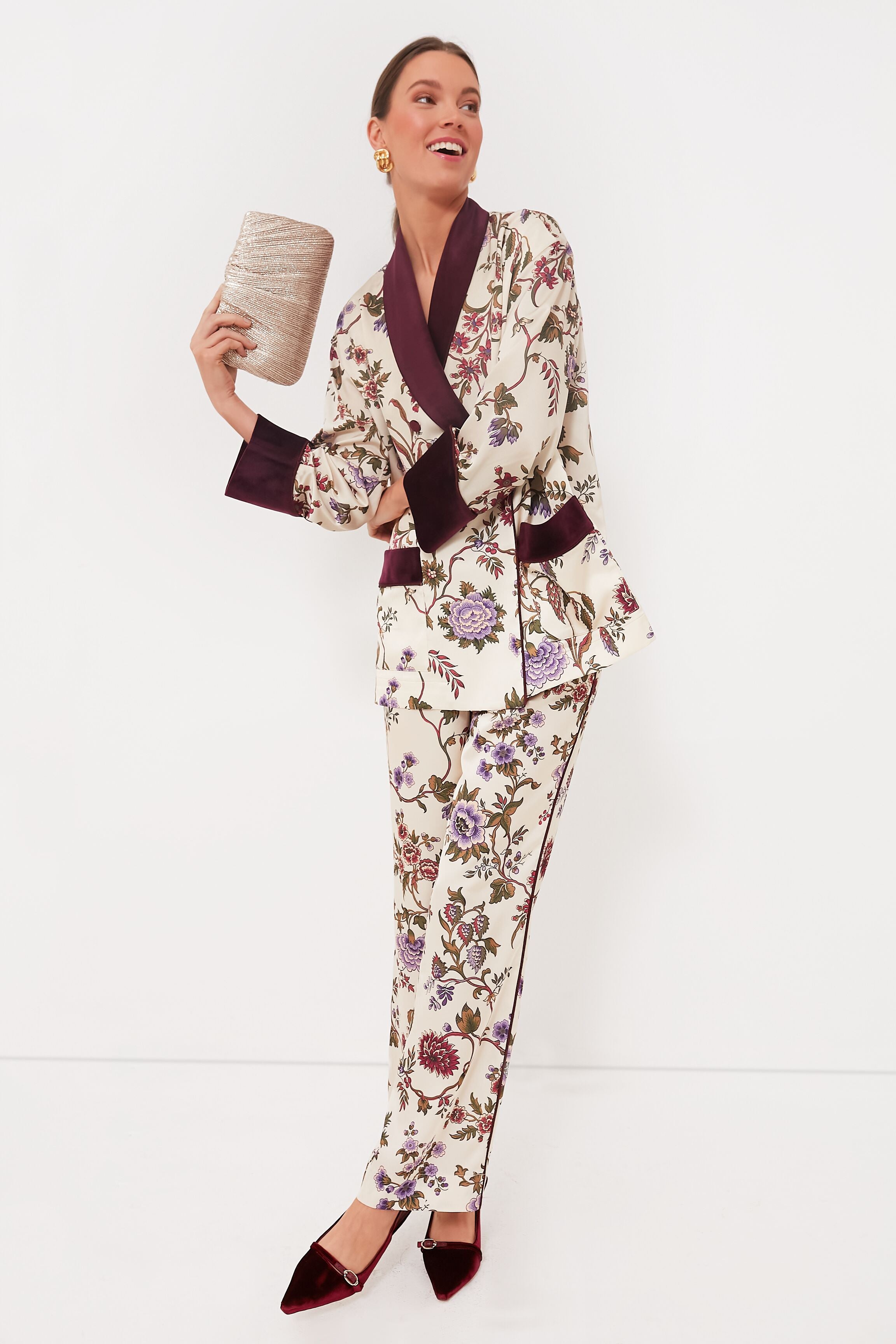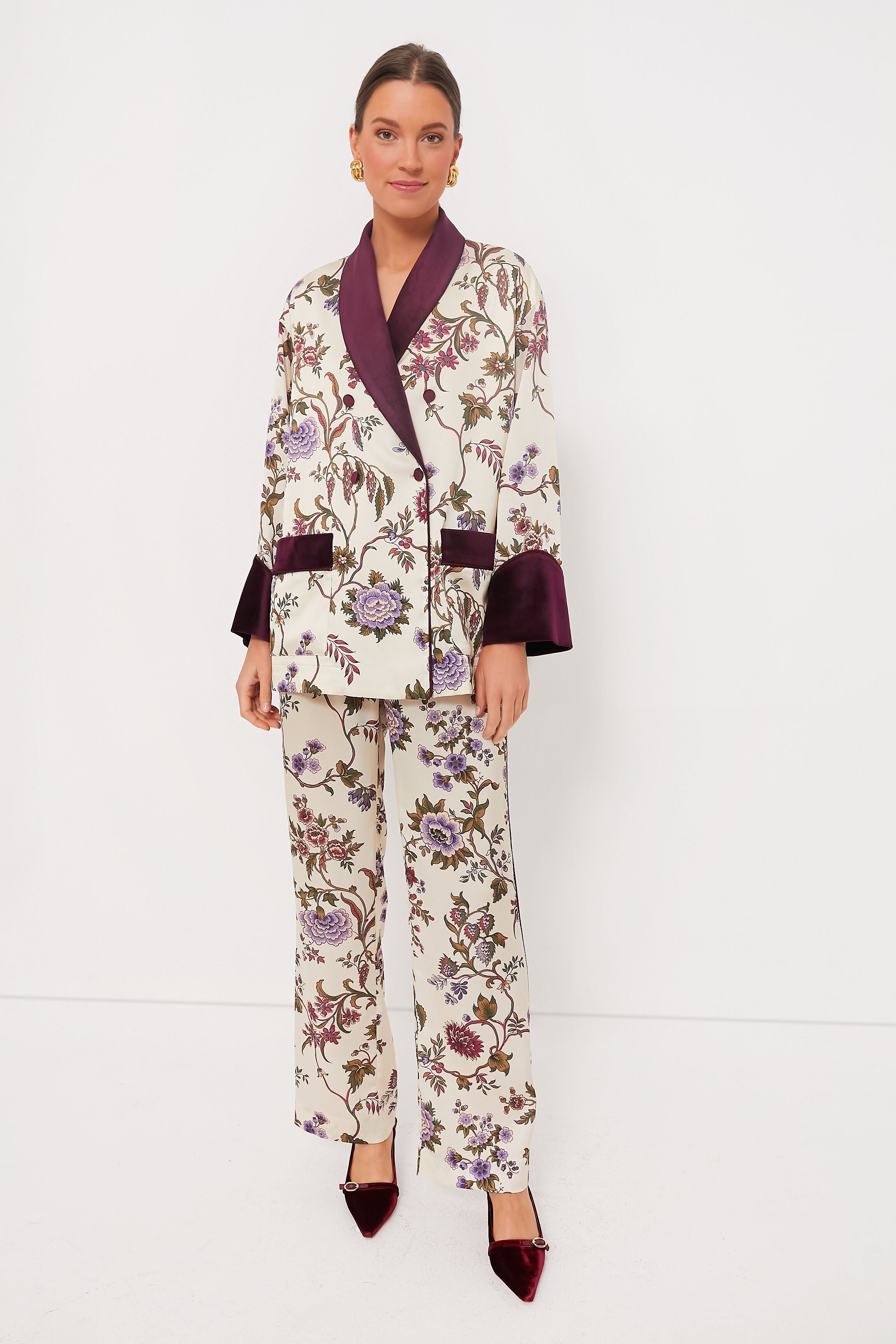 Sure to turn heads wherever you go. the Chantilly Vine Smoking Jacket is truly one of a kind. Printed with one of our signature prints for the season and trimmed with velvet in a rich hue. this luxe style features an elegant shawl lapel and patch pockets at the hips to top off an already fabulous silhouette. Go full maximalist and pair it with the matching Solene pants. or style it with a mini skirt for a flirty look that's sure to impress.