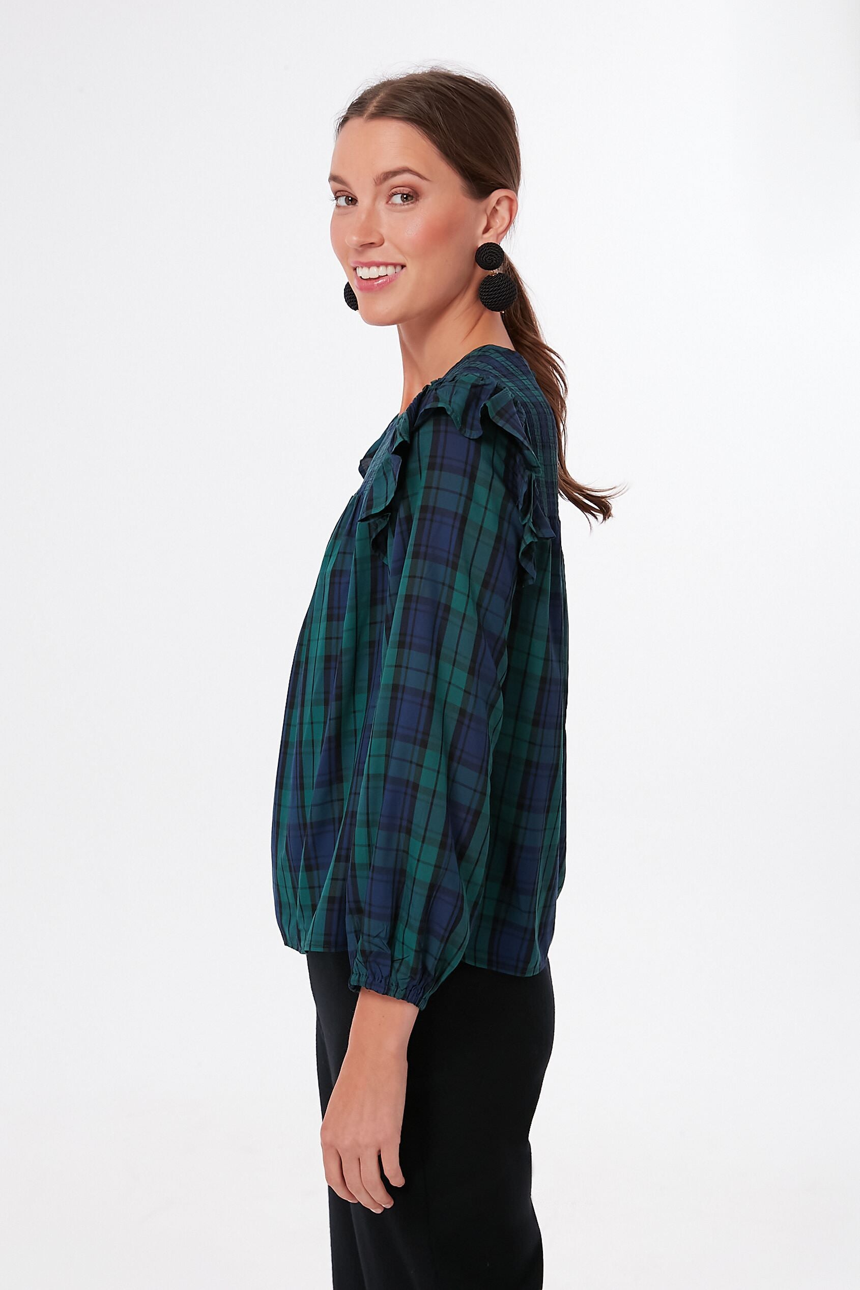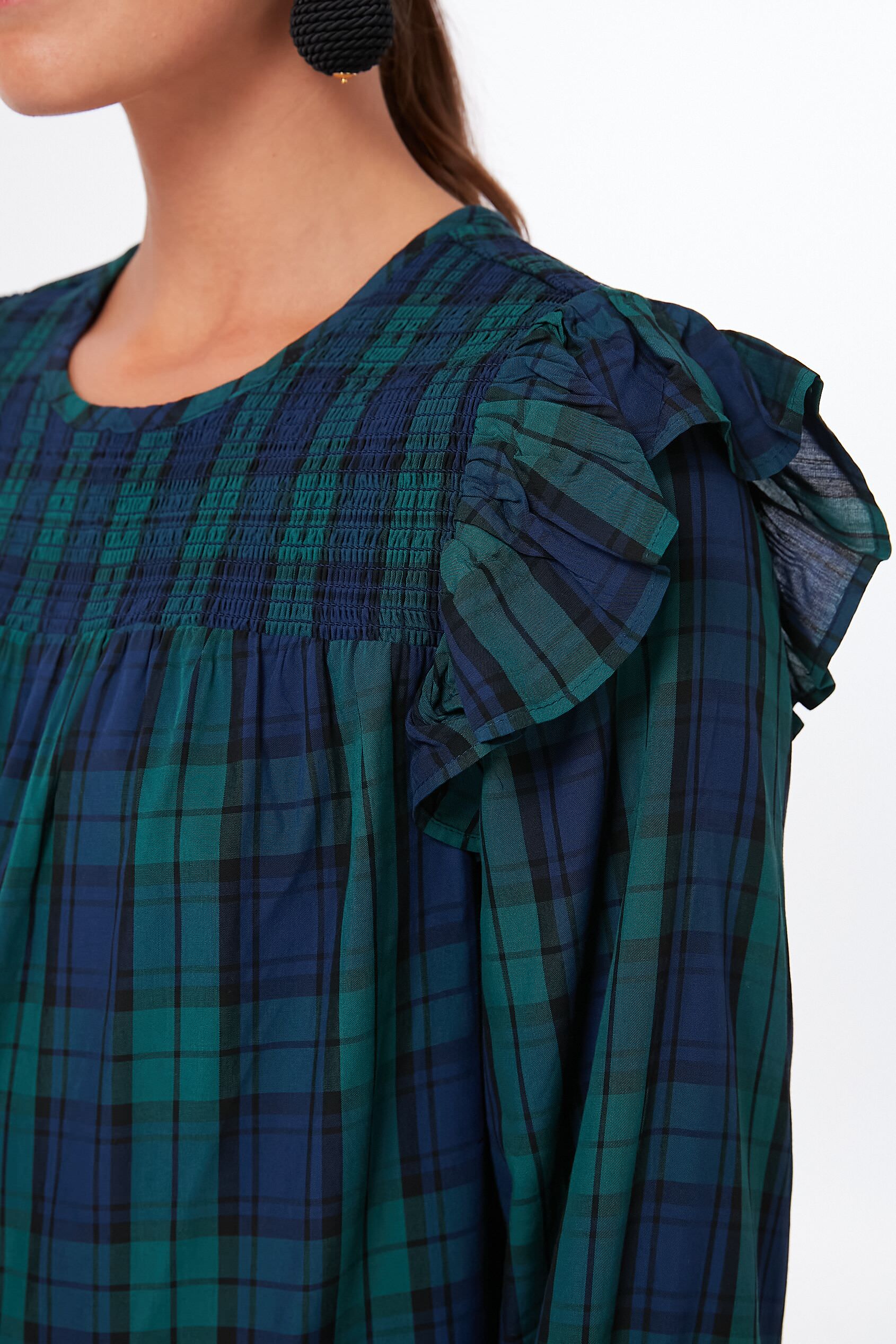 The Charleston Green Blackwatch Long Sleeve Popover aims to make festive holiday dressing easy. This sophisticated and timeless silhouette features chic blouson sleeves. a smocked yoke. and ruffle trim in an all-over plaid print you are sure to love. Style with dark denim and statement earrings for the office holiday party. or with a mini skirt and party heels to stand under the mistletoe.