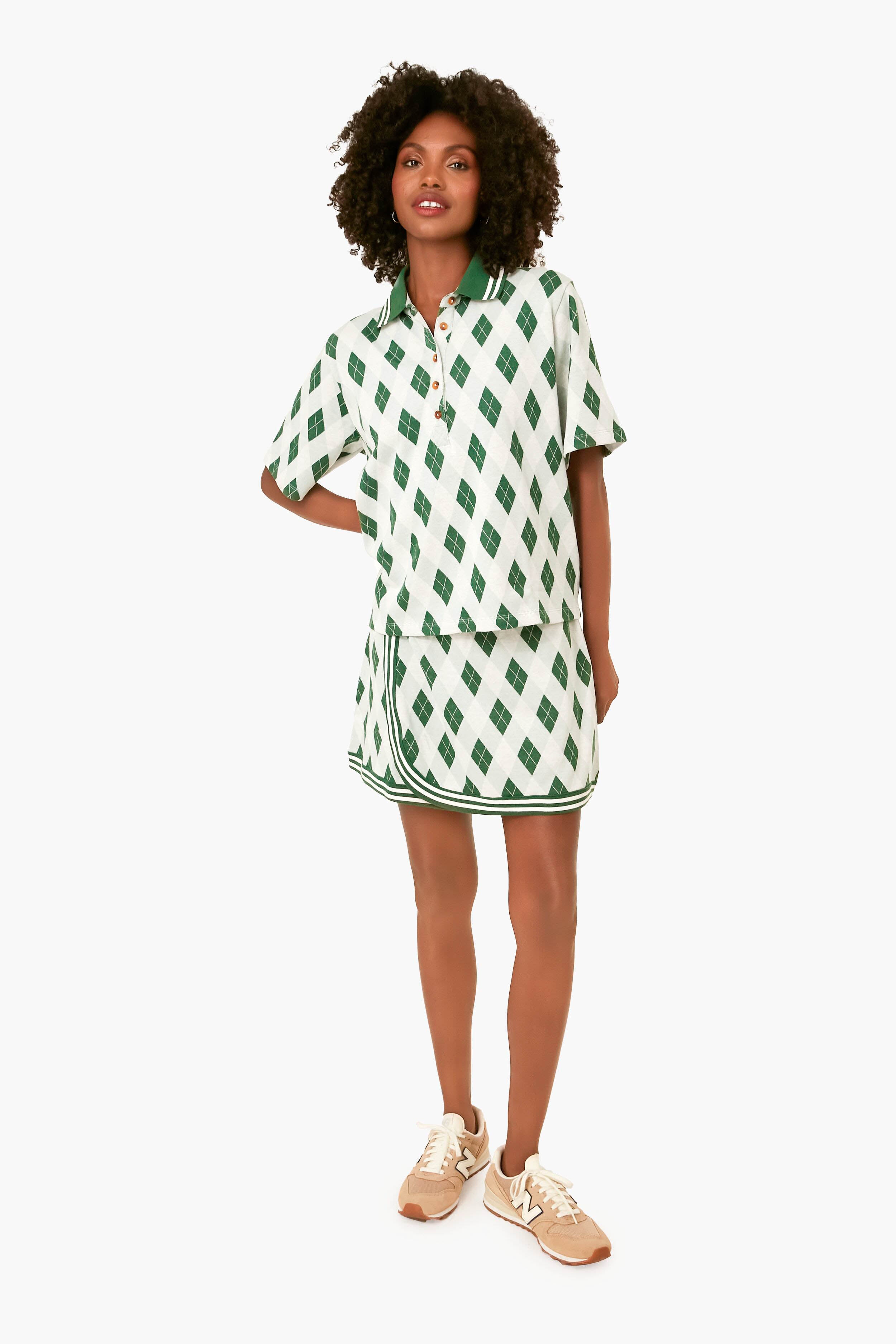 Clueless in the best way. the Check Clubhouse Reece Skirt is the athleisure chic look of your dreams. In a knit jacquard diamond design. this bottom features a faux wrap design. soft elastic waistband. curved hemline. and an internal step in short. We are wearing this with the matching top or your go-to sport shirt for an elevated style. on or off the course.