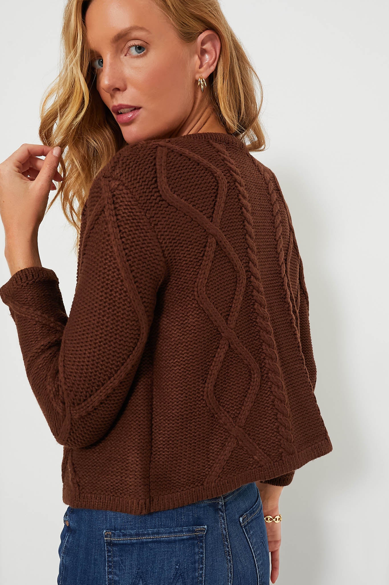 The Collins Cardigan boasts a chic cable knit design with a slightly cropped body and snap button closure at the neckline. Perfect for casual days or elevated occasions. we are styling it with denim and ballet flats or with the matching Chocolate Twill Pleated Preston Skort and boots for a monochromatic look.