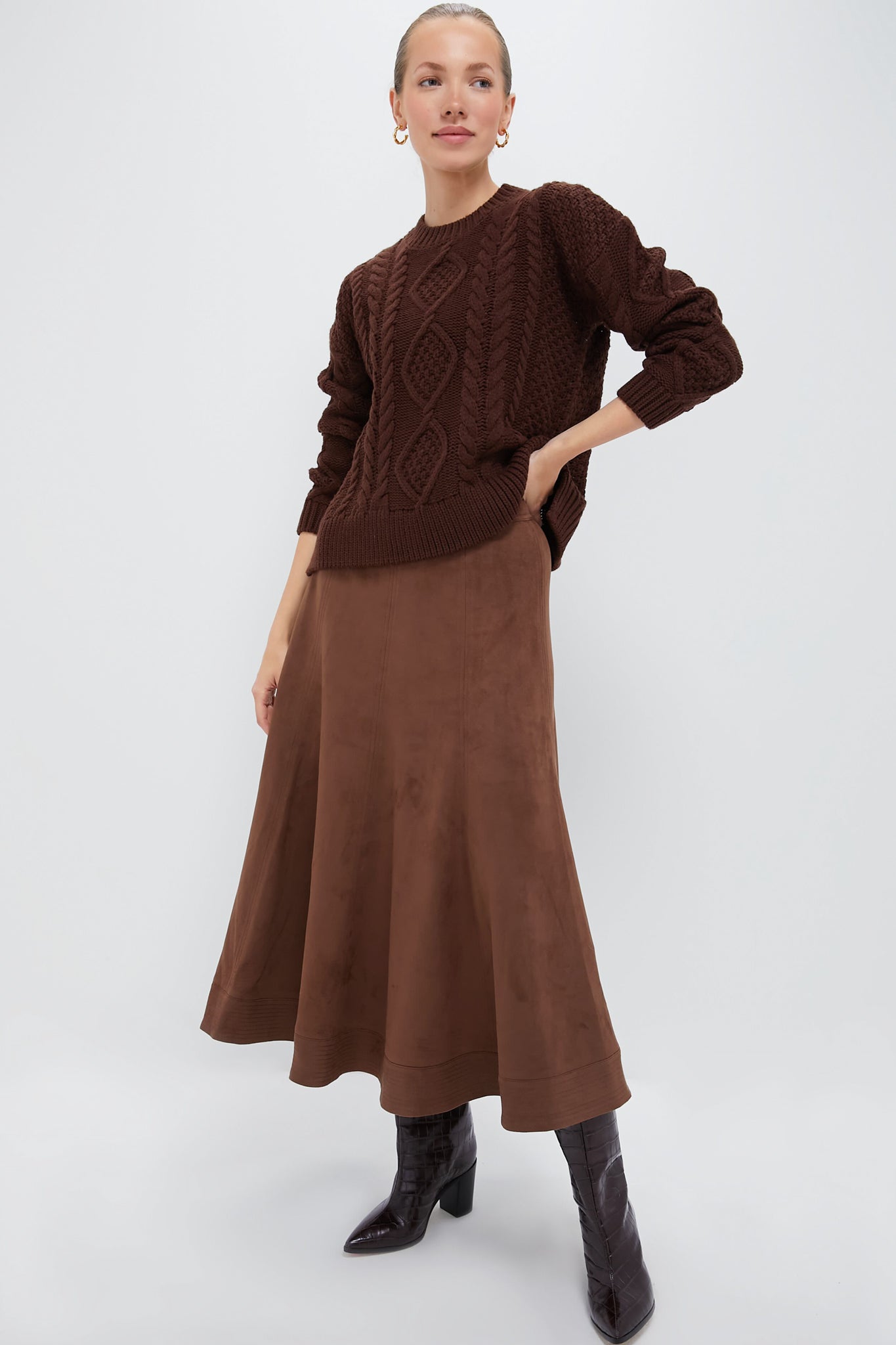 We cannot get enough of the color. fabric. and silhouette of the Chocolate Suede Brynn Skirt. With a seasonless hue and a flattering A-line silhouette with vertical seam detailing. this style is like nothing in your closet. Pair with a sweater and boots for date nights. or a button down and loafers for the office!