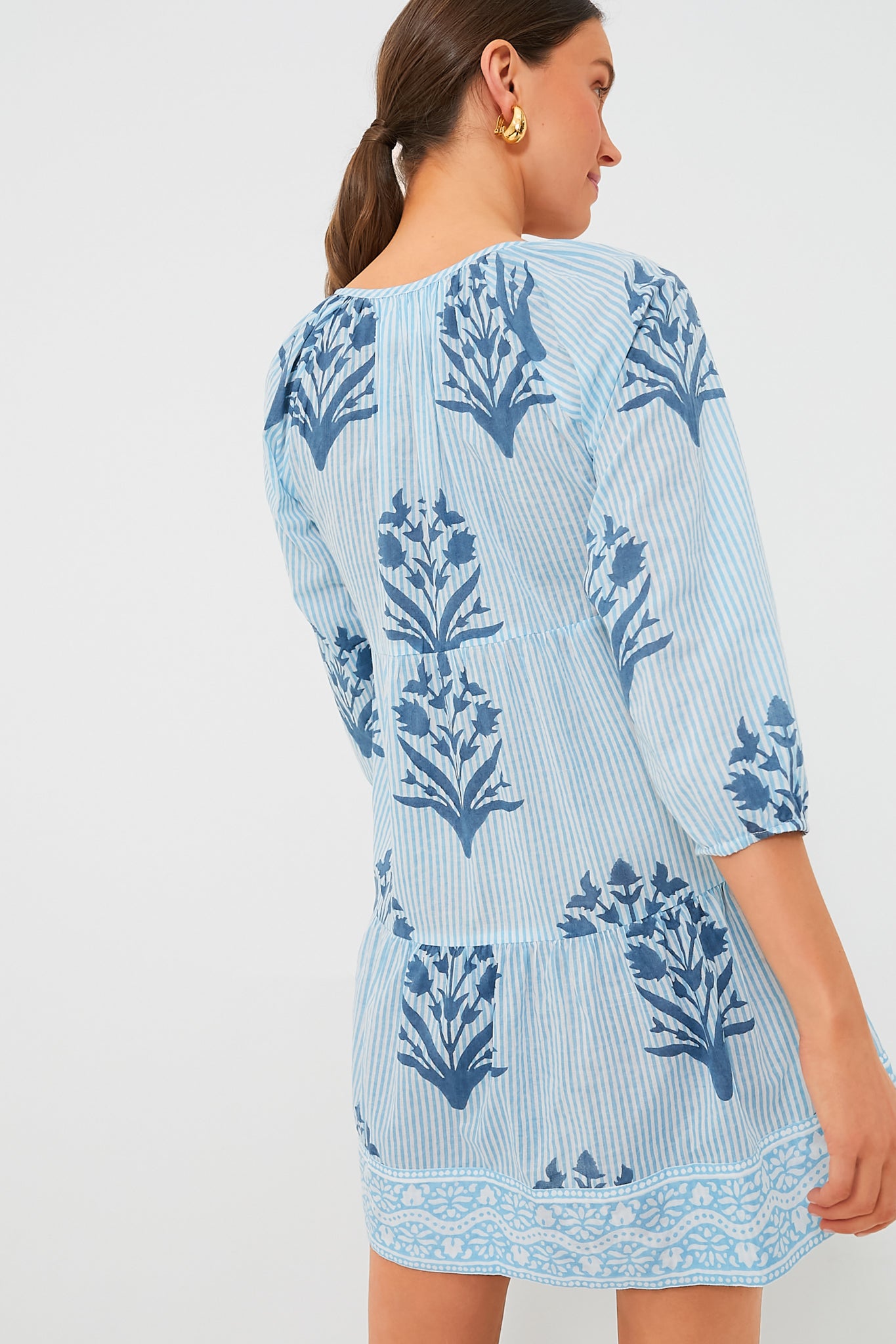 The Classic Blue Priya Dress. with bell sleeves and a dropped waist. has an easy. voluminous shape that lends itself to a relaxed aesthetic. The easy colors and eye-catching print make this breezy style perfect for the warm-weather months. Throw on over a bathing suit with sandals after a day by the sea. or pair with espadrilles and statement earrings for dinner on the patio!
