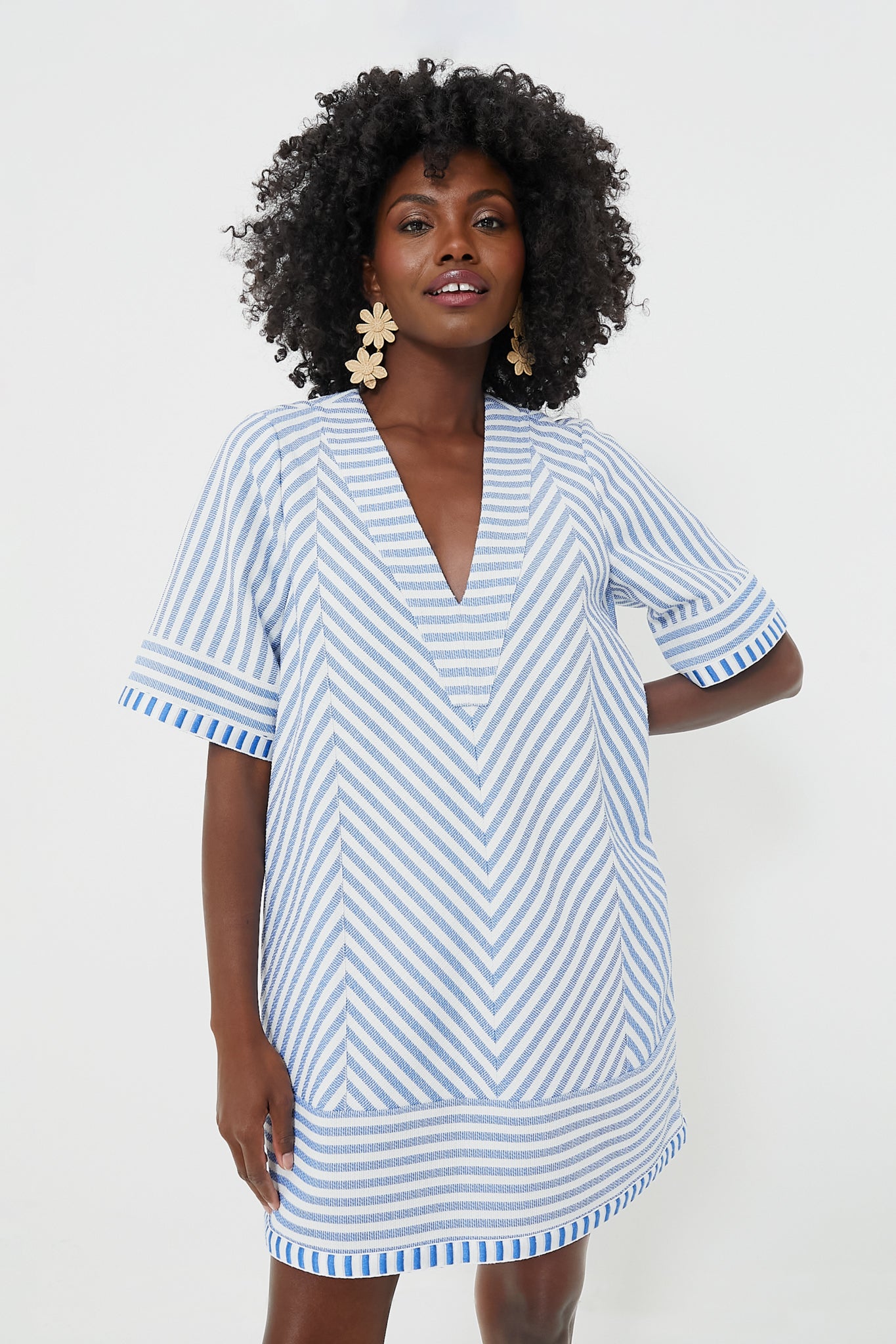 Introducing the Coastal Stripe Foster Dress! This relaxed mini features a special yarn-dyed fabric with a hand-placed coastal blue stripe pattern. The flattering shift silhouette features a V-neckline. short sleeves. and contrast hems. Pair with sandals or espadrilles and statement earrings for a day of wandering the boardwalk or grabbing ice cream in town!