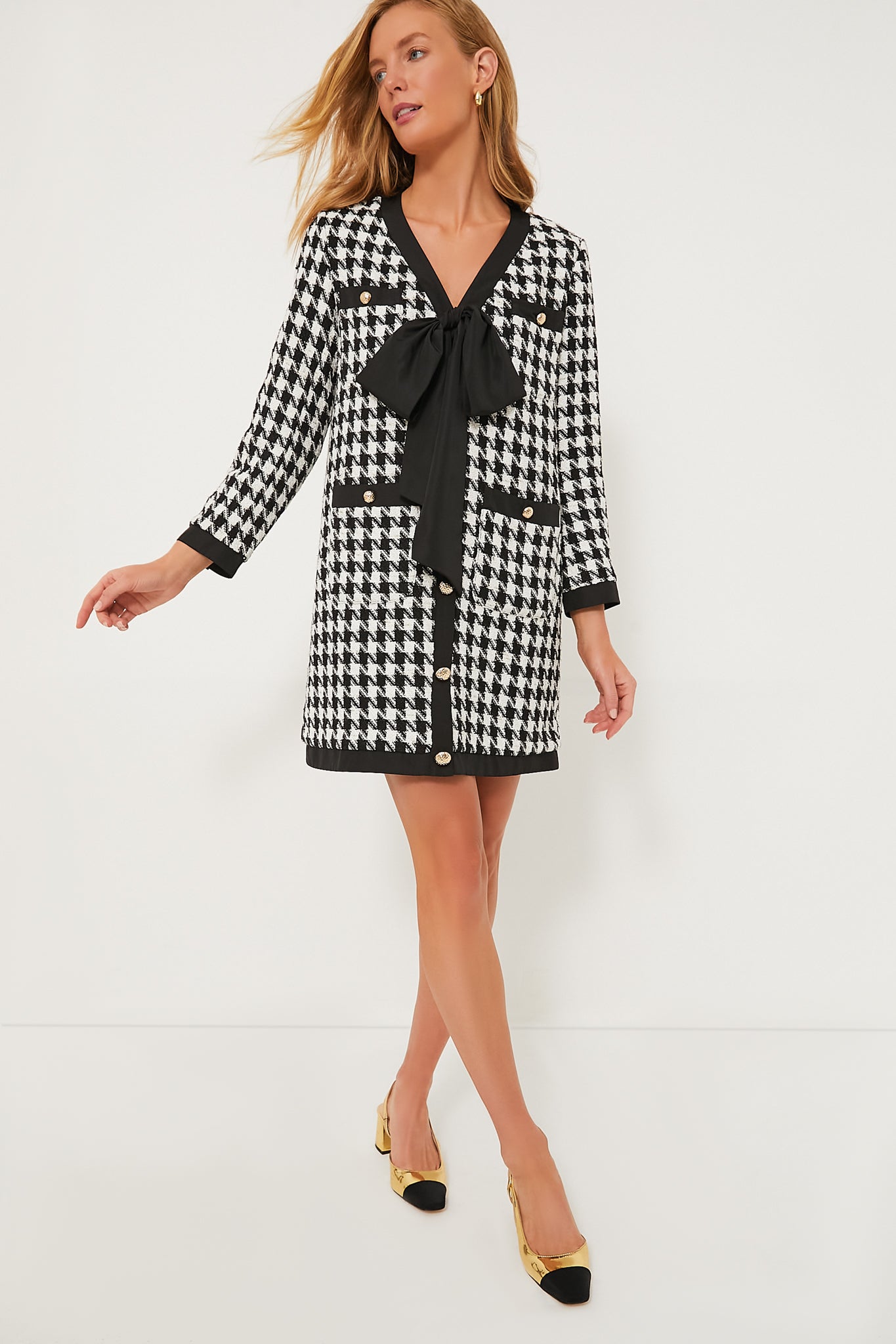 Classic meets glamorous in the Coco Tweed Bow Dress. Crafted from a luxe houndstooth tweed and complete with gold hammered buttons. this chic take on a timeless shirt dress will have you feeling and looking the part. Style with flats and a tote for an enviable work ready outfit and switch to festive earrings and statement heels for a celebration worthy look!