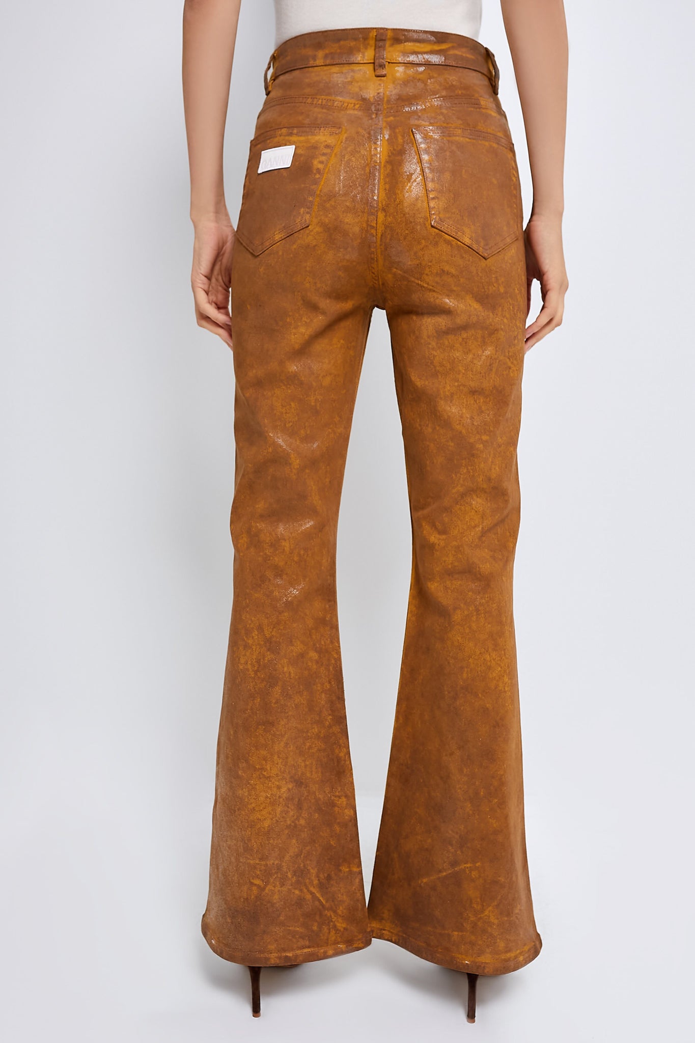 The Cognac Foil Overdyed Denim Flare Jeans are a fun take on a classic style. Featuring a rich color. foil covering. and flared silhouette. we recomend pairing with a white button down. heels. and a bucket bag for an elevated look!