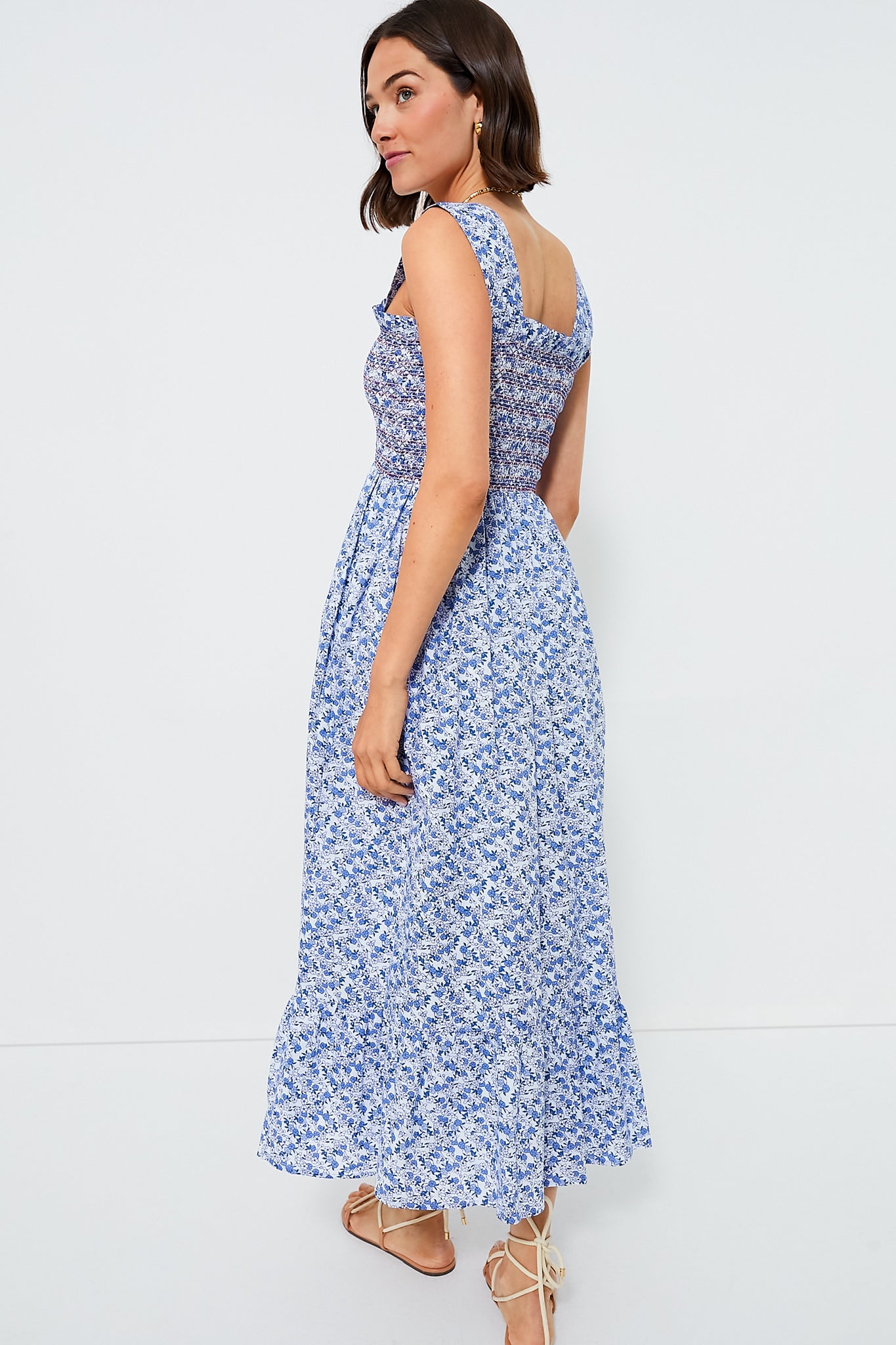 Both beautiful and practical. the Garden Dress is a sophisticated throw-and-go piece. Featuring wide straps. a contrast-stitch smocked bodice. and full-length skirt. this style boasts subtle details such as a ruffle detail along the bodice and wide ruffle hem. Pair with sandals or dress up with espadrilles!