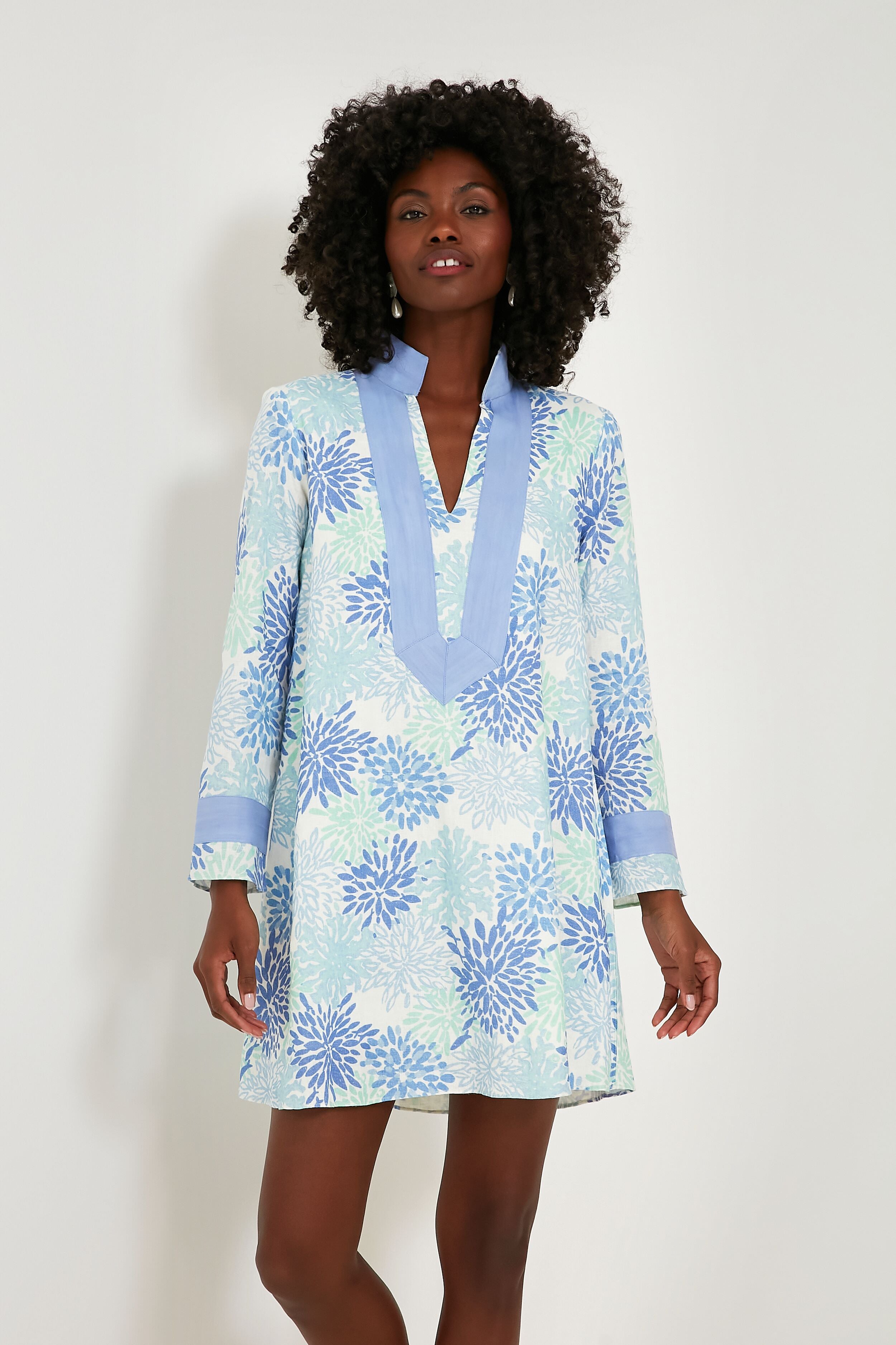 We've streamlined your summer outfit formula with the Long Sleeve Classic A-Line Tunic. This mini features a fun and fresh coral print with contrast blue trim on the neckline and cuffs for a polished finish. Getting ready for summertime adventures has never been this easy. simply add gold jewelry with heels or sandals for beachside cocktails or pool parties.