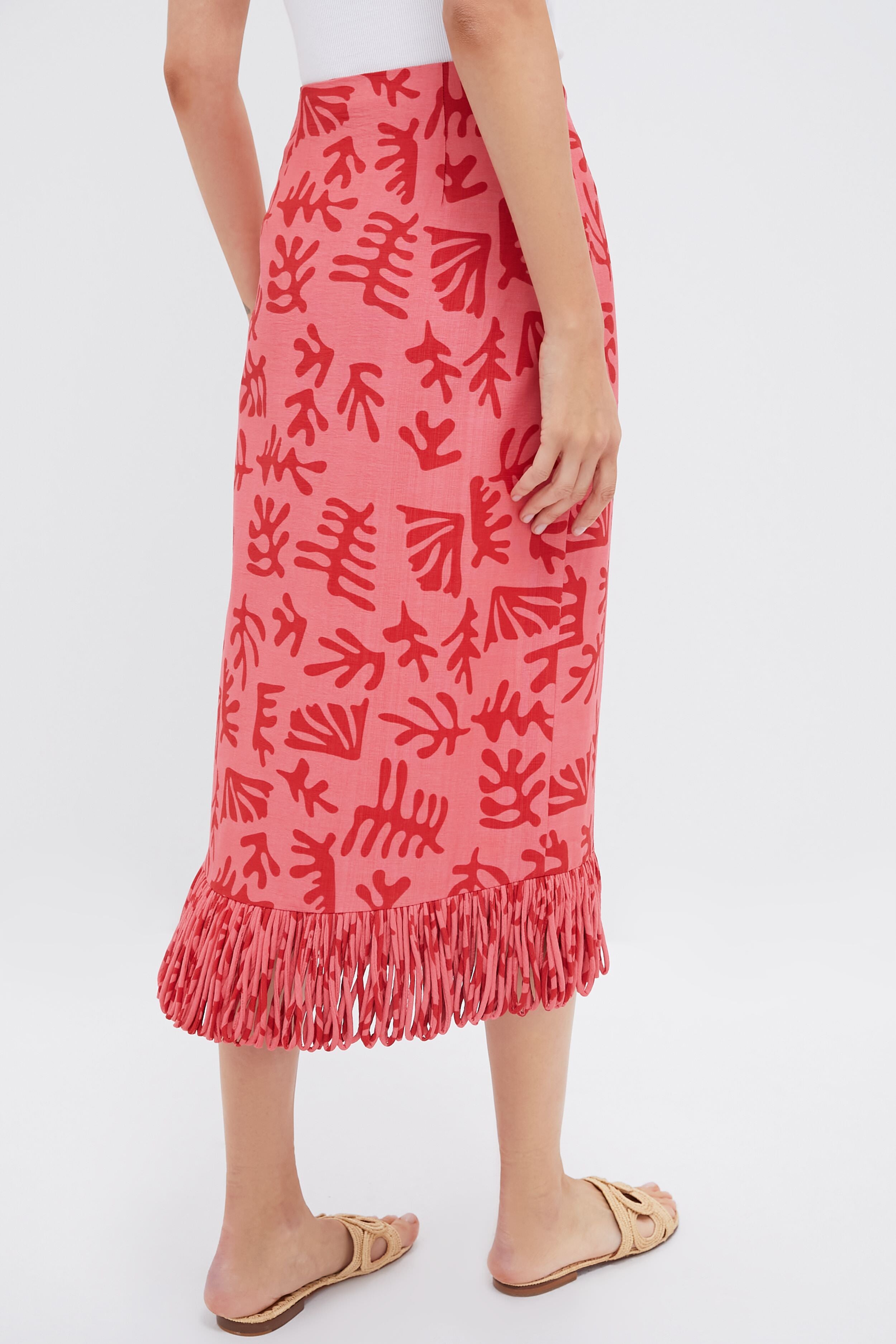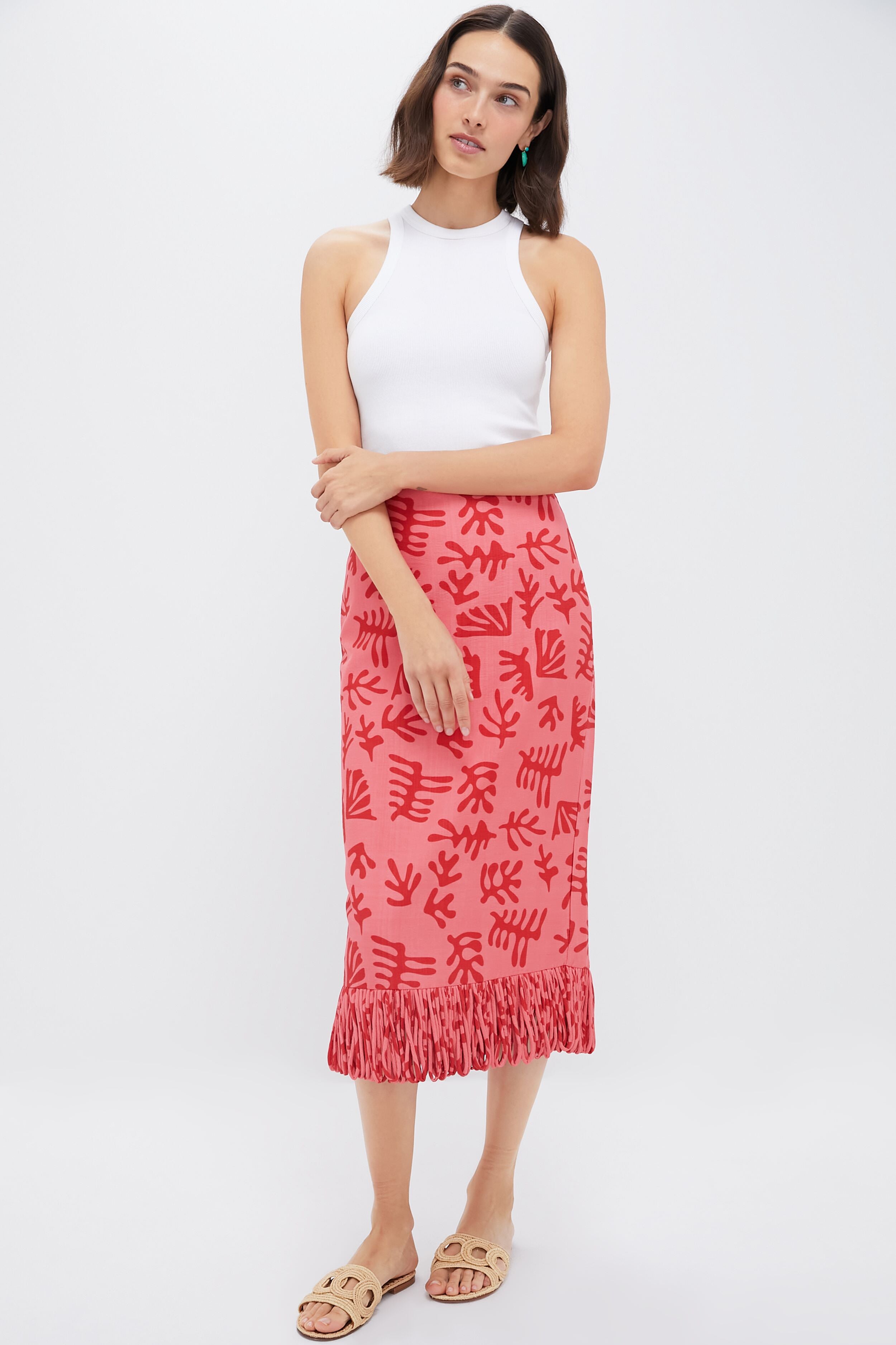 The Coral & Red Reef Print Cozumel Skirt is a fun and punchy skirt for your resort escape. Featuring a coral print. loop detailing at the hem. and midi length. this skirt is both ultra flattering and stylish! We styled it with versatile white tank. raffia sandals. and a woven clutch.